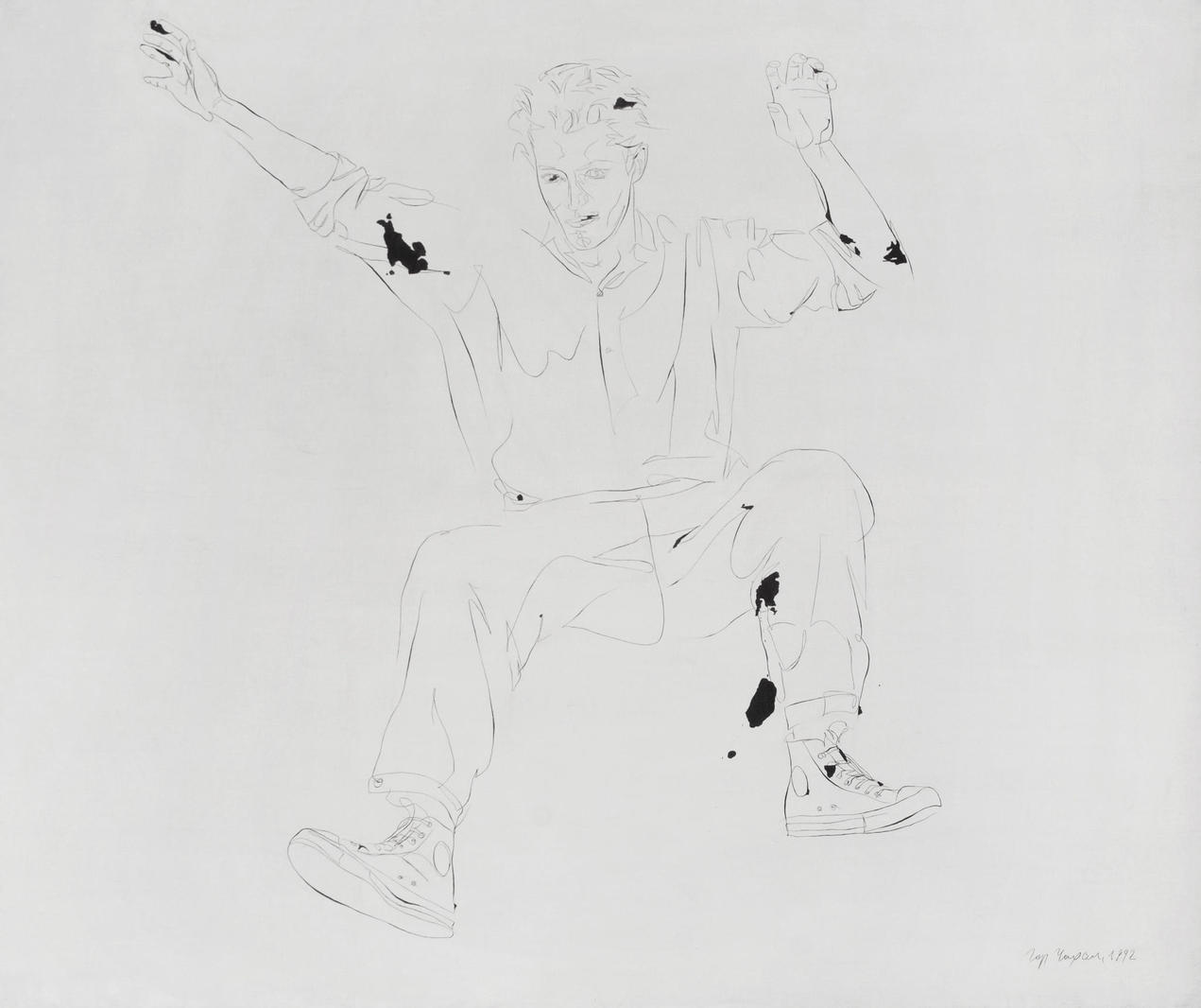И вот именно к самоотчуждению стремится Гор Чахал, создавая образ поэта-декадента, отстраненно созерцающего перестройку, словно падение Ниагарского водопада, и вдруг обнаруживающего себя унесенным его потоком (образ одного из его стихотворений). Первый из представленных рисунков запечатлевает непосредственно падение поэта — как олицетворение культуры, — в неуклюжей позе зависшего в пустом пространстве неизвестности.