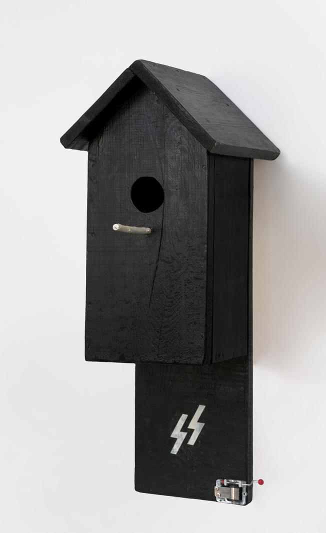 «Скворечник — это такой “гемютлихкайт” (немецкое слово, обозначающее тепло и уют) нацизма. Я показываю контраст милой музыки и мерзости нацизма», — комментирует Филиппов. Действительно, так все и происходило в первой половине XX века: пока из радиоприемников доносились красивые мелодии, в повседневной жизни вершились страшные дела. Филиппов заключил ощущение этого уюта «с двойным дном» в форму невинного птичьего домика. Возможно, его жители — это «орлики» национал-социалистической Германии, частью герба которой был орел с широко распахнутыми крыльями. Перед нами символ репрессивной, тоталитарной власти, которая обозначена внешне атрибутом СС, но активная идеологическая составляющая внутри, то есть в головах. Как говорит художник: «Руны — знак, орлы — в подсознании».V
