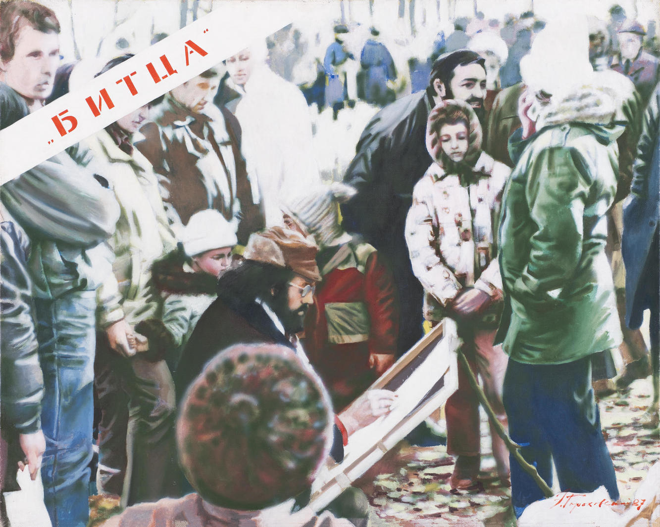 В представленной картине 1987 года Гороховский изображает, возможно, тот самый или, может быть, иной, более обыденный день из жизни “Битцы”. Многочисленная публика, окружив сидящего художника, с интересом наблюдает за процессом его работы. Для удобства оперев свой условный “этюдник” на длинный сук, легким движением руки он создает на листе бумаги некий образ, возможно, графический портрет кого-то из присутствующих за небольшую плату, как это часто делают уличные художники. Композиция Гороховского напоминает мгновение из потока будничной жизни, но в действительности является отражением значимой части культурной хроники эпохи перестройки, свидетельством начавшихся перемен.V