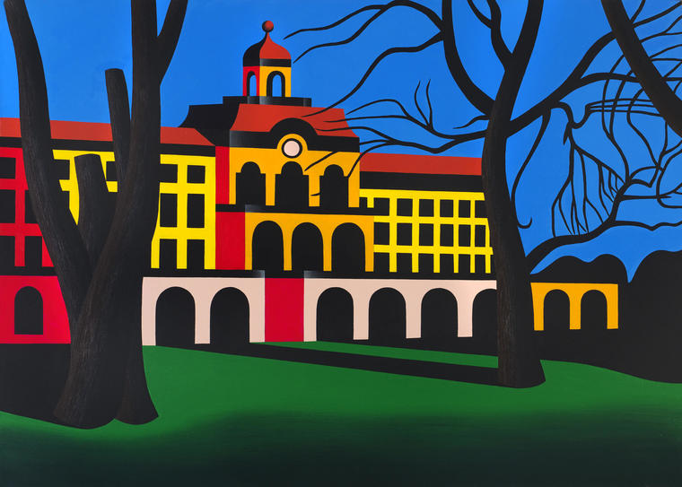 В первых этюдах, небольших и вертикально вытянутых по формату, он изображает этот вид буквально «как он есть». В последующих работах большего формата он перерабатывает композицию, «разворачивает» поле вдоль, чтобы был виден игровой момент на нем. Художник выстраивает ясную геометрию ландшафта, чуть смещая соответственно композиционному замыслу массивы построек. Эта геометрическая ритмичности пространства внизу сочетается с естественной природной абстракцией динамичного движущегося неба.