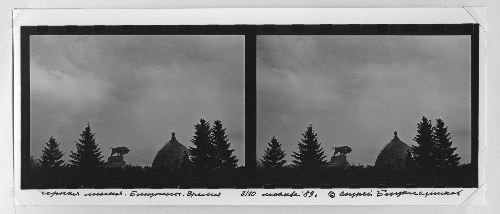 Аккуратно и подробно подписанная по нижнему краю фотокомпозиция Андрея Безукладникова из серии «Черная линия. Близнецы. Время» представляет собой разделенные вертикальной черной полосой два кадра с практически неуловимым смещением ракурса. Перед нами вид на венчающую главный портик фасада павильона «Мясная промышленность» скульптурную композицию авторства Наума Конгисера «Боец с быком» и большой стеклянный купол павильона «Космос» на ВДНХ.
