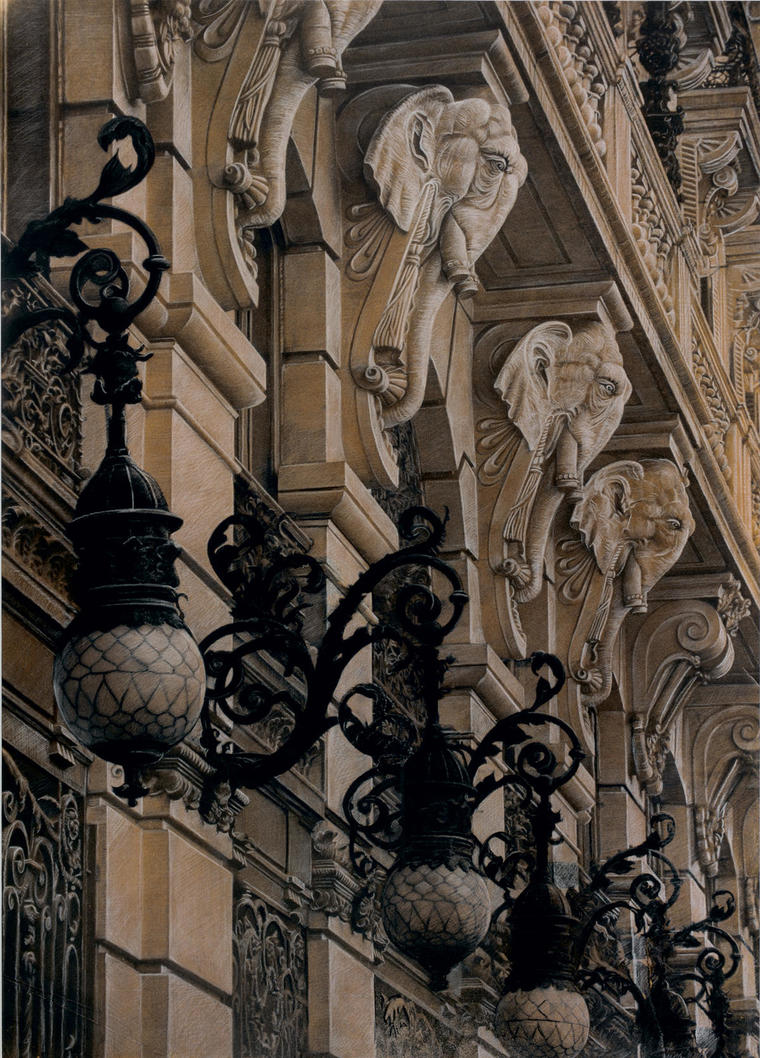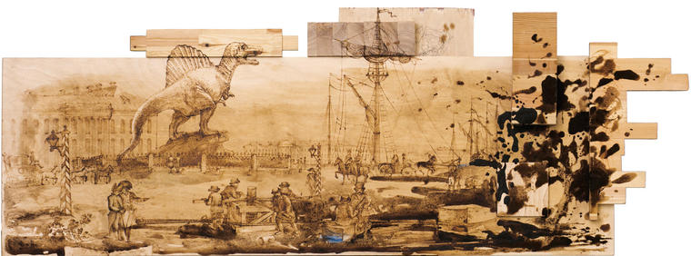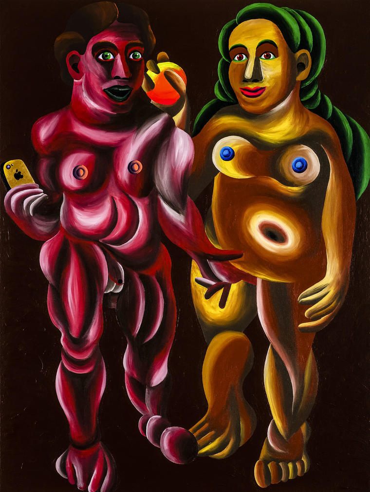 Множество одинаковых лиц, отделенных от тела, символизирует их взаимозаменяемость — однородность этих «морд», их стадность: человекообразные, но не похожие на человека, лишенные духовности, а оттого и разнообразия. Вместе с тем эти маски, как называет их сам художник, «личины», которые можно легко менять в бесконечном приспособлении к «среде обитания». Эту трактовку подтверждают работы конца 1980-х, где лица висят на стене, прибитые гвоздями, да и в этой работе на персонажа с розовой шеей и ухом будто надета желтая маска. Но не исключено, что это — «мутации», ведь для мира Целкова это явление частое. Тем не менее приятнее вида «морды», чем на представленной картине, сложно найти: два глаза по приемлемой диагонали, нос и губы прямые и правильные, уши на месте. Лоб, конечно, низковат, но выражение лица почти что полное достоинства — так что перед нами, может даже, интеллигент из этого «невиданного доселе племени» Олега Целкова. V