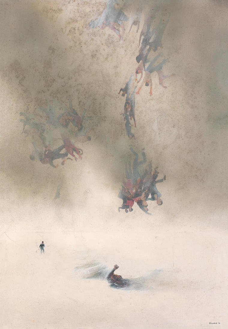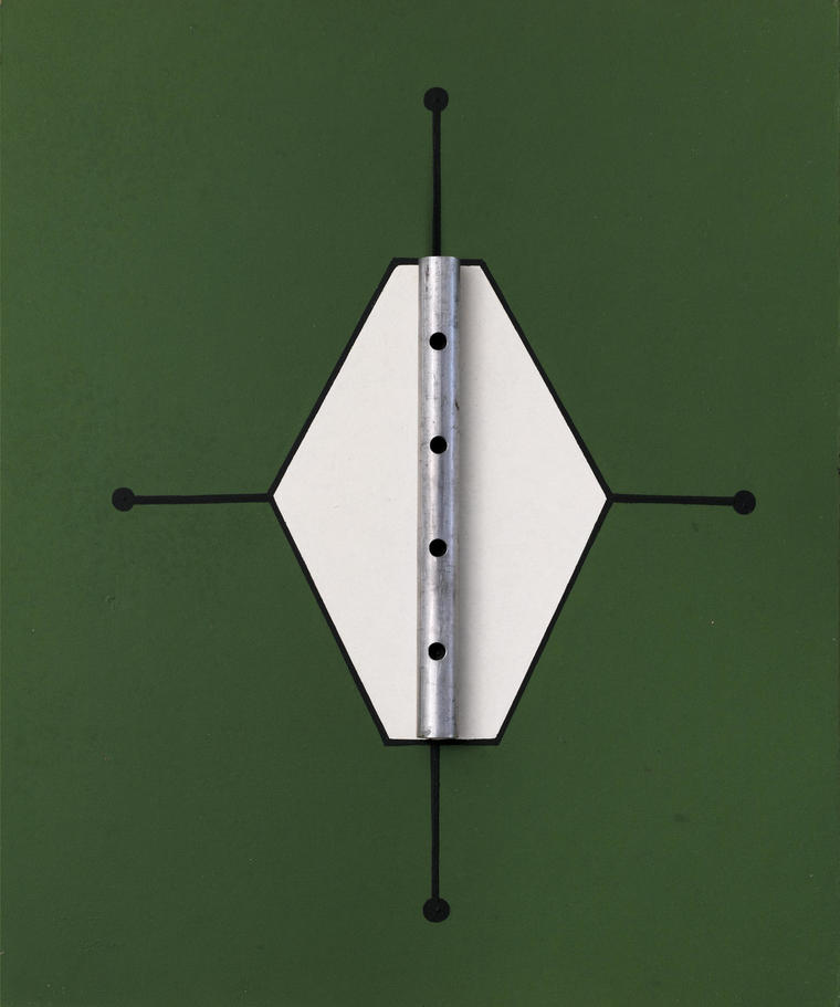 В начале 1980-х «пространства переживаний» выкристаллизовываются в холодные «космические» формы: геометрические фигуры складываются в ритмичные ряды на фоне монохромного «стального» фона. Представленная работа — одна из «идеальных» версий таких абстрактных композиций, причем выполненная в редкой для этого цикла технике — живописи. По своей структуре этот минималистичный и сдержанный формат «пространства переживаний» можно назвать классическим в искусстве Янкилевского, поскольку именно он в разных вариациях чаще всего появляется в произведениях художника — от графики и коллажей до главнейших полиптихов, в том числе из циклов «Адам и Ева» и «Take a Train…».