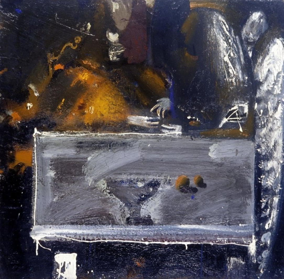 Олег Голосий был мистиком, все его работы наполнены тайными смыслами и загадками, шутливыми или очень серьезными, красноречивыми или запутанными. В картине «Хиромантия» мы видим героя, вопрошающего свою судьбу у Ангела — между ними идет разговор, мы читаем это по положению рук в центре композиции. Действие происходит в ничем не обозначенном пространстве, лишь из темноты проступают какие-то проемы. Стол как бы вывернут на зрителя, и на нем зависли — плоская «не реальная» Чаша Судьбы и объемные, с тенью, вполне «реальные» фрукты. Сами фигуры прописаны очень сложно, они будто ускользают от восприятия, постоянно меняясь. Так Голосий выворачивает всю геометрию пространства, заставляя зрителя все время перепрыгивать из двухмерного в трехмерное, из умозрительного в мирское.