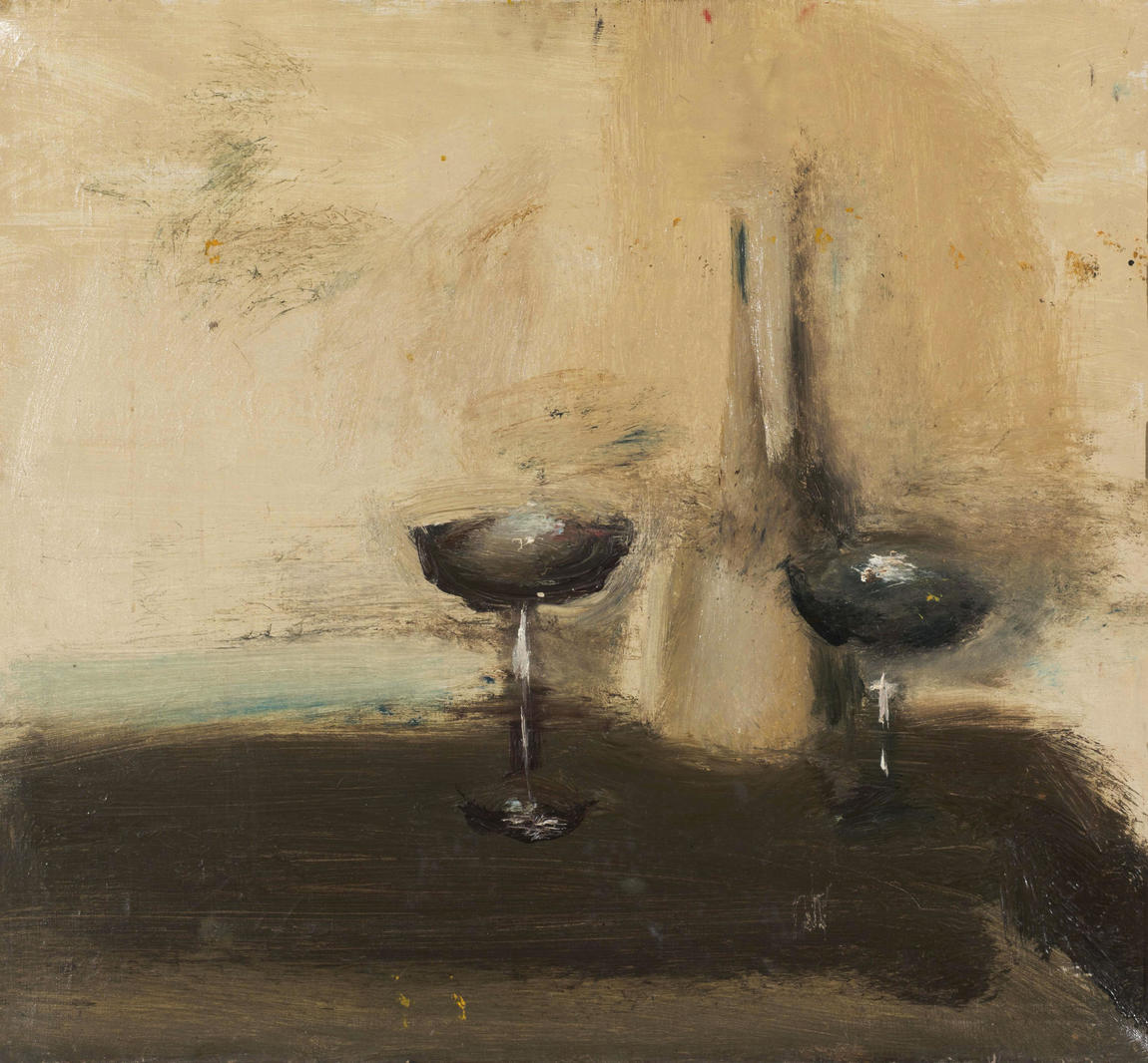 Натюрморт для художника — это основа основ, с него начинается обучение мастерству. И для каждого художника это особое отношение к предмету изображения — через него можно выразить очень многое. Олег Голосий в раннем творчестве писал натюрморты часто, как в Днепропетровском художественном училище, так и в Киевском художественном институте, вообще это был один из любимых его жанров. Он пользовался натюрмортом, чтобы закрепить какое-либо интересное состояние, настроение или просто идею. На представленной картине изображены креманки — чашечки для мороженого, и бутылка белого шампанского. В конце 1980-х во многих кафе Киева подавали кофе с мороженым именно в таких креманках, также как и другие десерты со взбитыми сливками. Мы были парой, и часто тайком убегали из института, чтобы выпить кофе и съесть мороженого в кафе рядом, на Андреевском спуске. Так что этот натюрморт кроет в себе романтическую историю, настроение праздника и счастливые воспоминания о тайных встречах и разговорах в кафе.