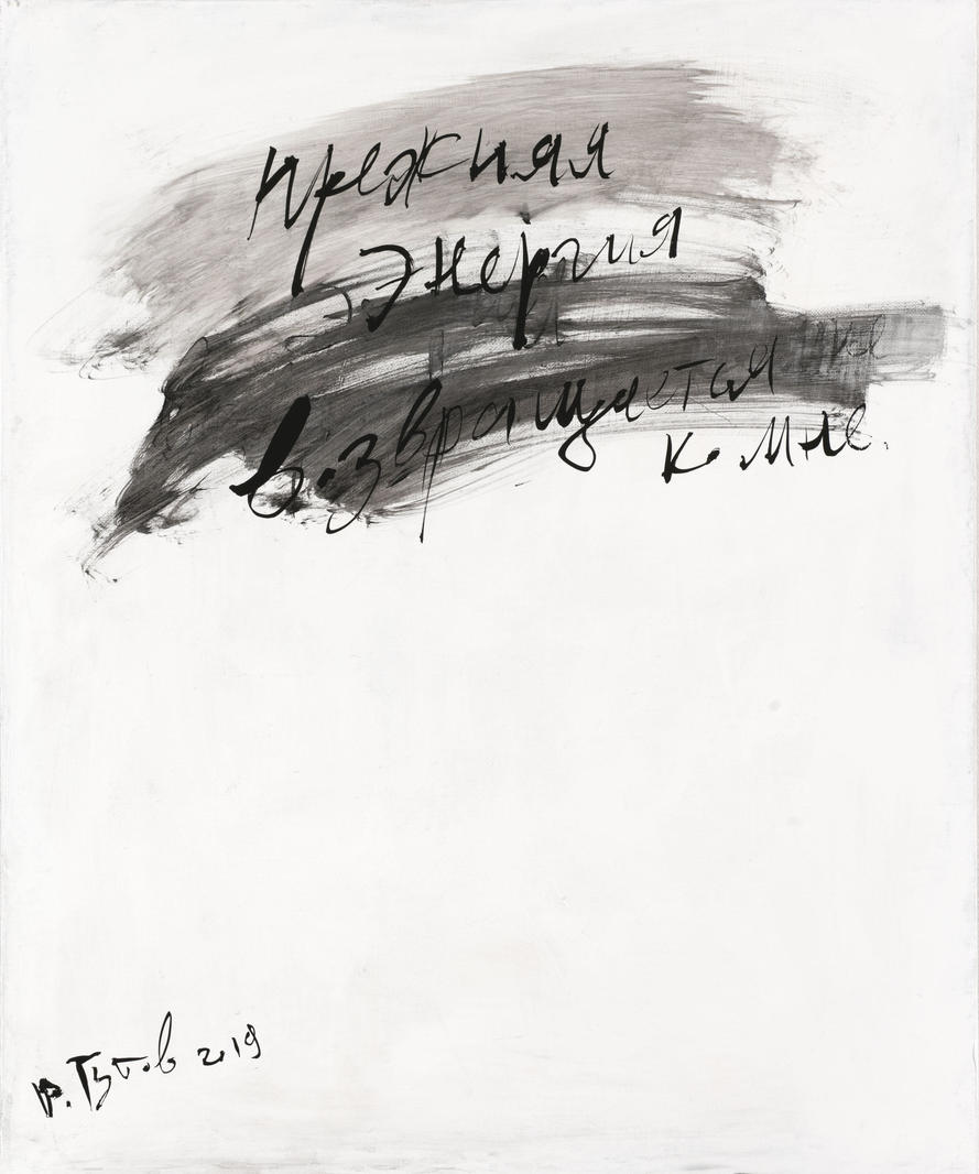 «Текстовые» произведения Дмитрия Гутова часто связаны с личными переживаниями, творческими муками, в них затрагиваются темы энергии, терпения и скоротечности времени. Представленная работа 2019 года — это ответ на работу, созданную в 2014 году с названием и аналогичным содержанием «Талант покинул, энергия ушла, девушка собирается», которая появилась в период острого кризиса и упадка. В цикле картин этого периода — это два полюса, два крайних состояния настроения и жизни. Концентрация на новом приливе сил здесь напоминает «восстание из пепла», как говорит сам Гутов: «И хотя эта работа 2019 года выглядит довольно жестко, но просто в такой форме возвращается энергия». V