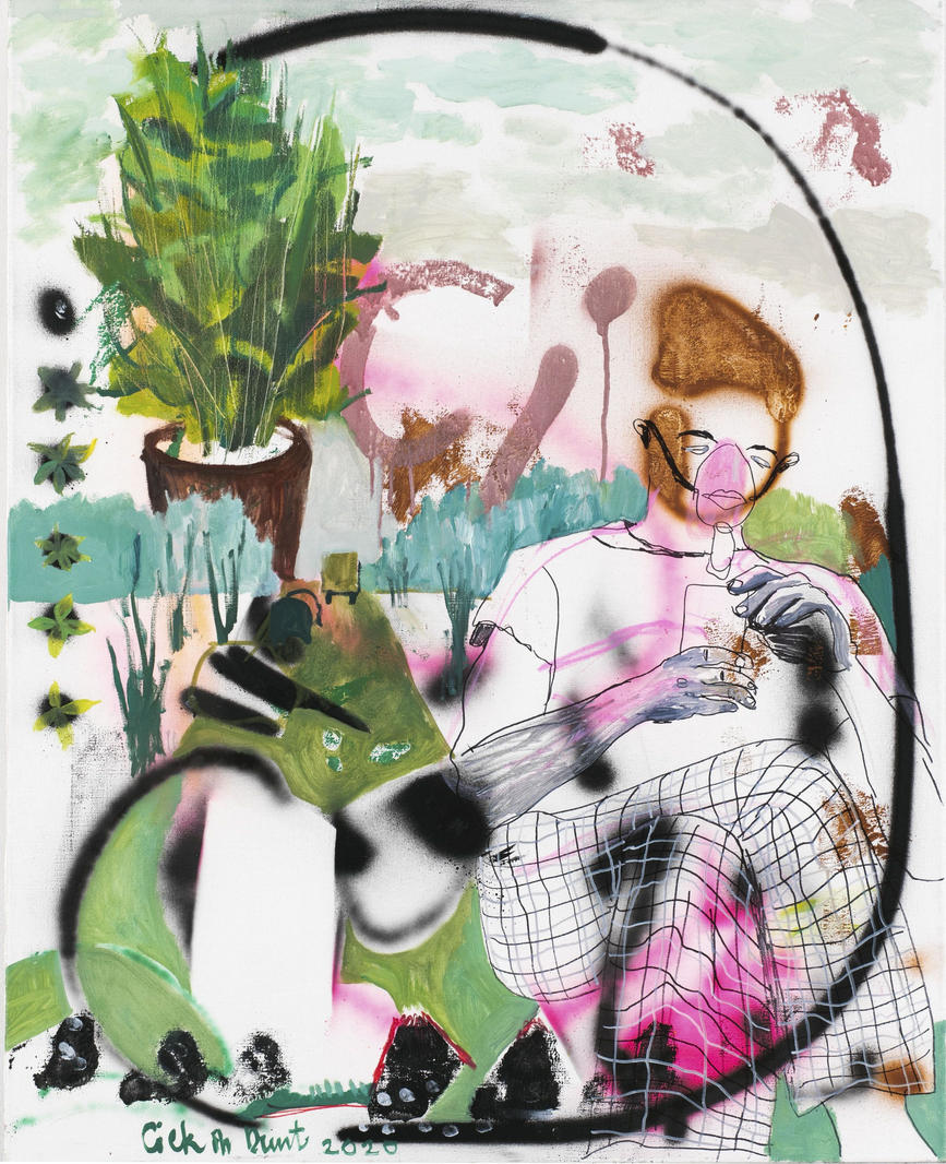 Я и мой муж, художник Виталя Черепанов, делали ингаляции по очереди, сначала я, потом он. И я его рисую. Молча. После ингаляции лучше помолчать минут 30. Слушали аудиокниги, цветок искусственный стоял на полу. Баллоны купили — хотелось для стрит-арта, но для холстов подошли.