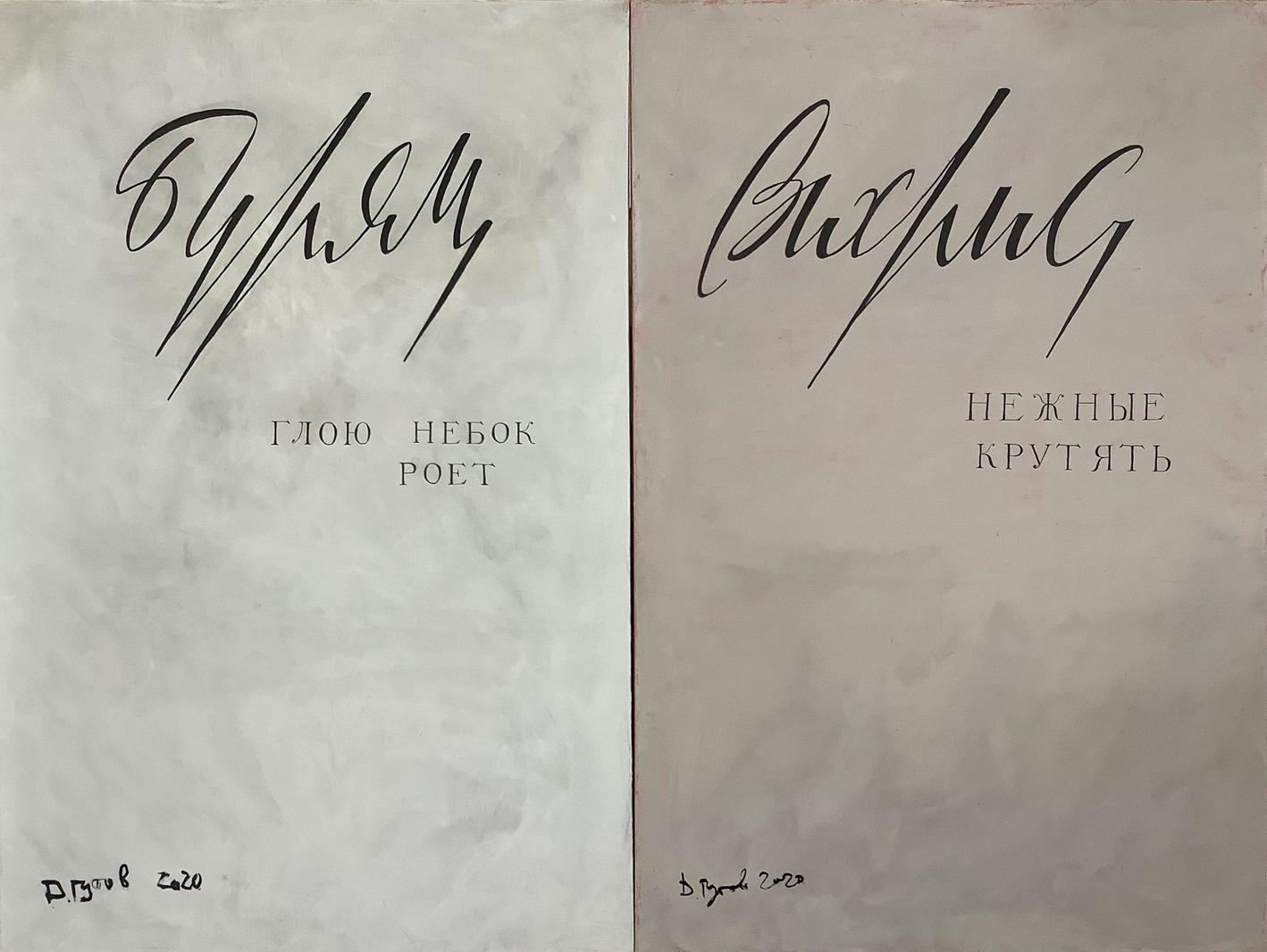 В какие-то незапамятные времена в рассказе «Ночь» Татьяны Толстой я увидел стихи Пушкина в такой записи: «Бурям, глою, небак, роет, Вихрись, нежны, екру, тя! Токаг, зверя, наза, воет, Тоза, плачет, кагди, тя!». Тогда на меня это произвело неизгладимое впечатление — что можно так читать Пушкина. Стихотворение в таком виде у меня много лет или десятилетий крутилось в голове. Потом, изучая всякие обложки, к которым, как известно, неравнодушен, я наткнулся на рисунок знаменитого советского шрифтовика Соломона Телингатера. Он делал переплет книги Ильи Эренбурга «Буря», издания 1950-го года. Мне очень понравилось, как написано у него это слово — «буря». И каким-то образом это написание из книги Эренбурга слилось со стихотворением Пушкина, вернее, пушкинским интертекстом. Так и появился этот диптих — из сочетания романа Эренбурга, шрифтов Телингатера и странного прочтения знаменитого стихотворения, которые удивительным образом преломились в моем сознании. «Буря» превратилось, естественно, в «бурям», а «вихри» стало «вихрис». Так как я работаю по памяти, без первоисточников, стихи оказались записаны несколько иначе.
