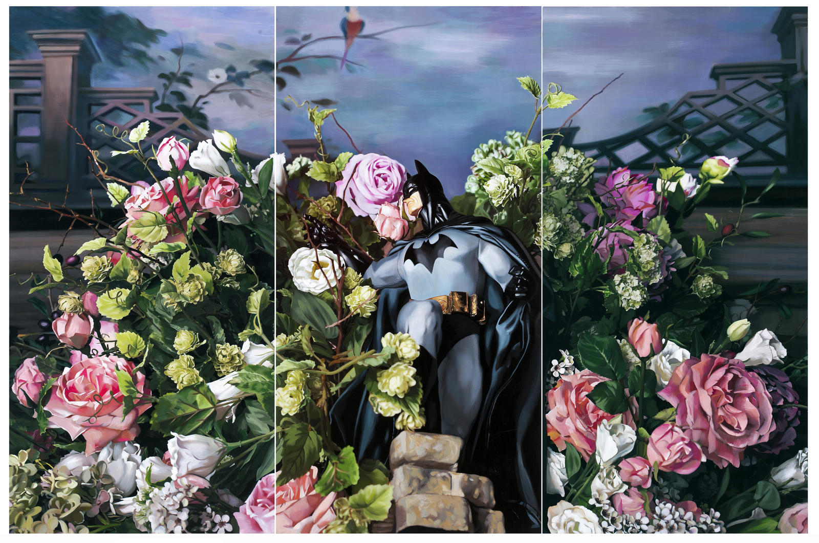 Впервые на такие темы Пётр Аксёнов выходит в 2009 году, когда создает серию работ «Dead Brand». В ней он изображает мраморные плиты, на которых выгравированы названия знакомых всем брендов: печальные статуи-ангелы расположились на надгробиях, выполненных в виде баночки крема или же клатча. Вся картина балансирует на грани между возвышенной трагедией и китчем. Подобный способ изображения действительности можно увидеть и в представленной работе «Бэтмен в раю», только здесь Пётр Аксёнов обращается к более метафизическим темам. Художник рассуждает о рае: сначала это место представляется цветущим садом, но после обнаруживается, что это лишь один букет, а фон оказывается не прекрасной действительностью, а словно нарисованной театральной декорацией. В работе присутствуют все характерные черты, которые отличают творчество Петра Аксёнова: особый авторский аллегоризм, внимание к деталям и, конечно, ирония. V