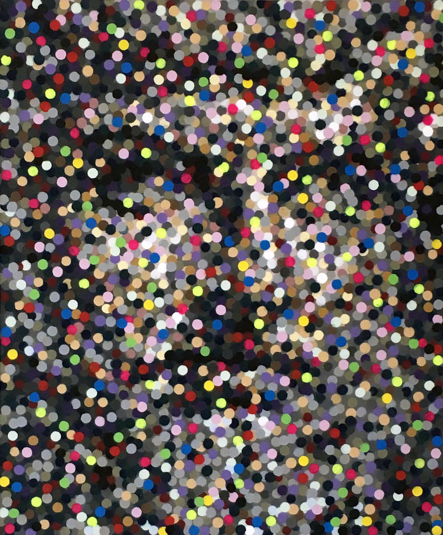 Неопуантилизм, в стилистике которого выполнена работа, определенным образом зашифровывает изображения. Основой сюжета здесь является кадрированый и гиперувеличенный мифологический герои. Это некий взгляд на историю искусства через призму современных технологий. История про новую мифологию, которую нам навязывают. Сейчас, в эпоху постправды, сдвигается фокус восприятия и место по настоящему важных вещей занимает миф.