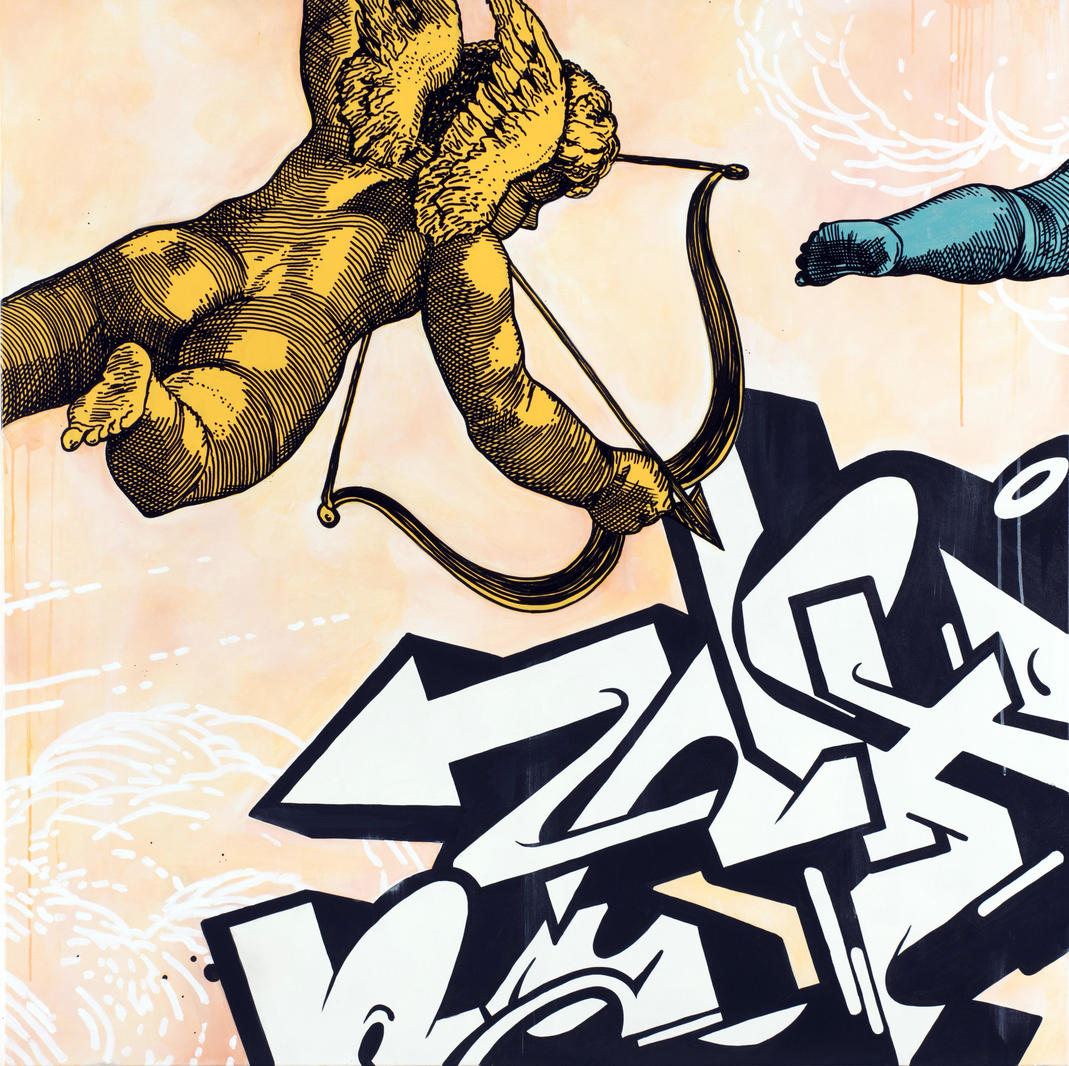 В работе «Выстрел» мы изображаем античный сюжет, где маленький купидон целится в граффити шрифт, который является отличительной и крайне узнаваемой чертой творчества Чеса. Этой работой мы пытаемся показать, что в один момент нас поразила стрела любви к уличному искусству и затаилась на всю жизнь. Данное произведение стало результатом нашей первой совместной станковой работы и, кажется, нам удалось совместить два абсолютно разных художественных течения.