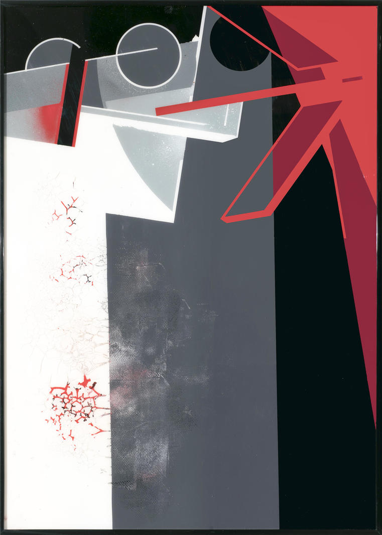 Это вторая и завершающая работа из экспериментальной серии «S». Серия создавалась «зеркальным» образом — изображение наносилось на оборотную сторону прозрачного пластика, а результат был уже с лицевой. Я использовал аэрозольную краску и различные растворители, которые вступали в химическое взаимодействие с пластиком и давали удивительный живописный результат.