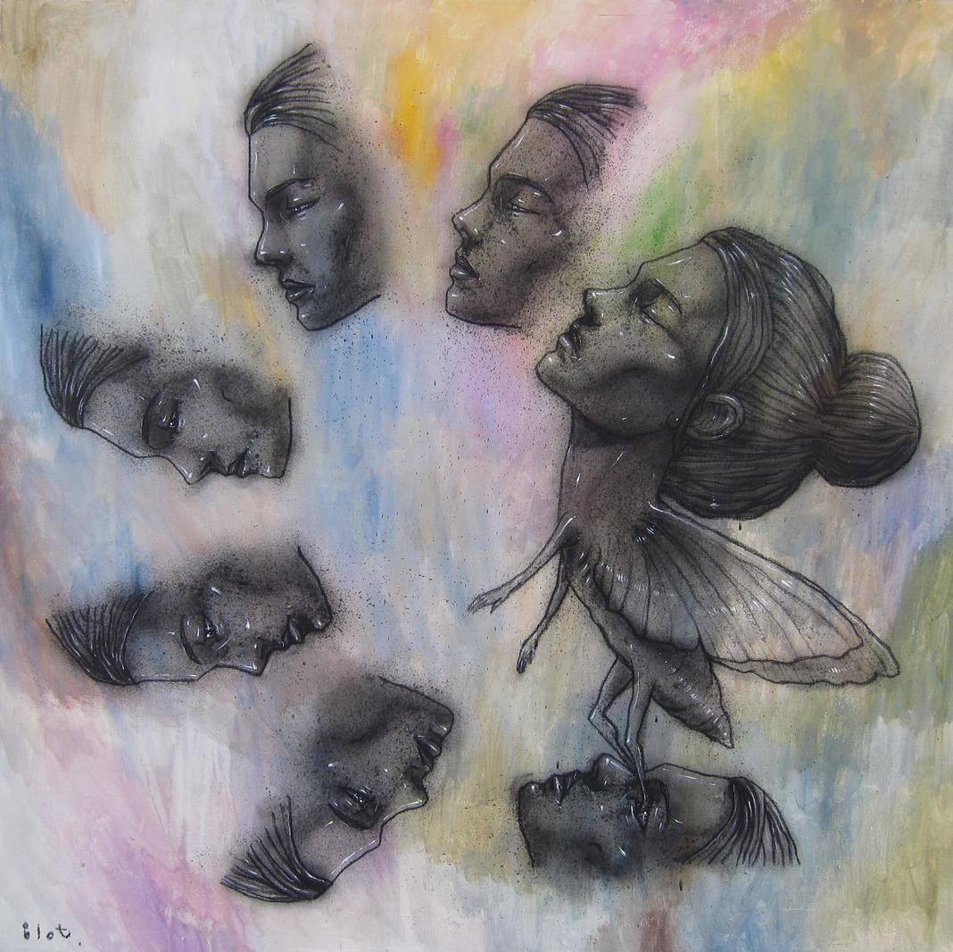 Доминантой картины стал образ с закрытыми глазами — рождение бессознательного. Здесь он начинает свой путь, еще совсем не ориентируясь в новом пространстве. Персонаж как будто пытается ухватиться за воздух, нащупать что-то конкретное в пустоте. Двигаясь вперед, состояние трансформируется, глаза открываются шире, все вокруг становится более четким и понятным. Пока, наконец, не формируется осознанность, которая накладывает отпечаток на наше бессознательное, образуя бесконечный цикл.