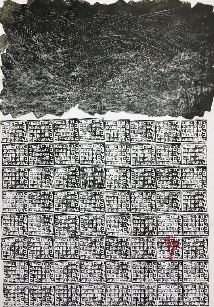 Серия работ «Серость» — это неотъемлемая часть проекта «Клетка» который строится на постоянной трансформации медиума, объект-фото-коллаж-графика-объект, где в процессе изменения я формирую свое видение на городское пространство и архитектуру в целом. В итоге я получаю очень видоизмененную структуру, которая больше не является укрытием и вытесняет человека. В представленной работе идентичные дома заполняют пространство листа, формируя один целый живой организм, но специфика печати, где каждый дом печатался отдельно, позволяет внести в каждый небольшое изменение, что делает их уникальными.