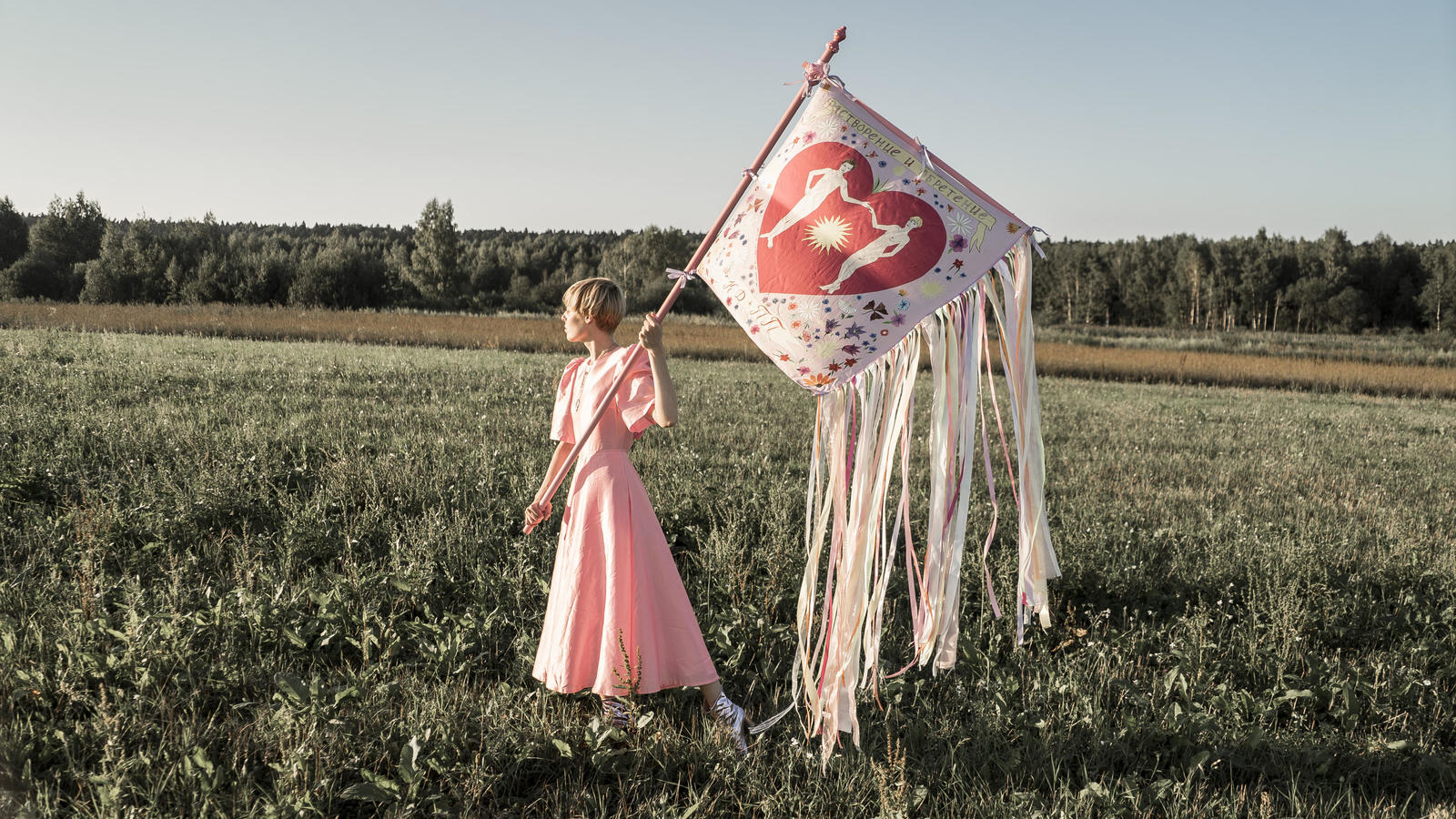 Этот проект был как продолжение моего подарка на день рождения для Паши Пепперштейна. На праздник я подарила ему этот шелковый флаг, который сама нарисовала и расшила цветными лентами. Позже, летом я снимала видео и фото часть, по сценарию это должен был быть сон Паши, в котором он видит нимфу одетую во все розовое, танцующую в русском поле с флагом любви. Эта работа относится к нашему любовному периоду, пусть и прошлому.