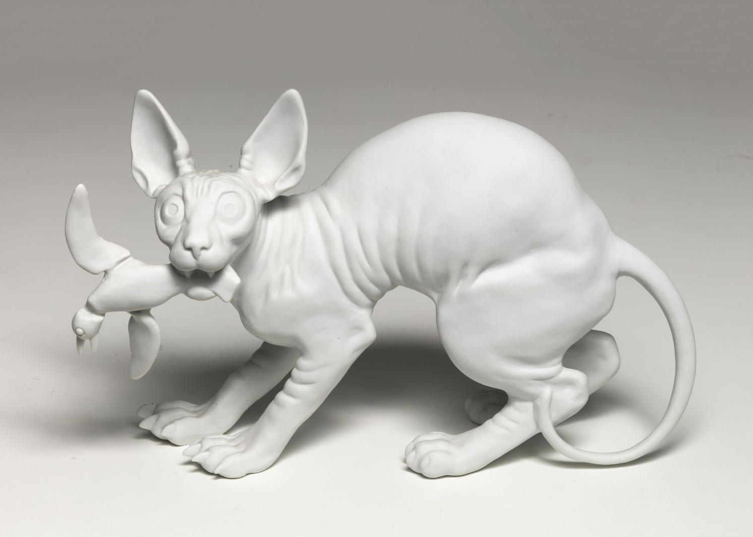 В представленной скульптуре 2020 года Брускин, соответственно духу эпохи глобализма, обращается к образу, который регулярно появляется в произведениях искусства с древних времен. Кошка с птицей возникает на древнеримской напольной мозаике, в XX веке Пабло Пикассо откликается этим образом на Гражданскую войну в Испании, вдохновленный его работой, художник-нонконформист Владимир Яковлев создает множество произведений с этим мотивом, в которых находит выражение эпоха застоя СССР. В XXI веке Гриша Брускин возвращает этот символ агрессии власти в пространство искусства, создавая миниатюрную фарфоровую скульптуру, которая открывает вопрос о сегодняшней политической ситуации в России и мире. V