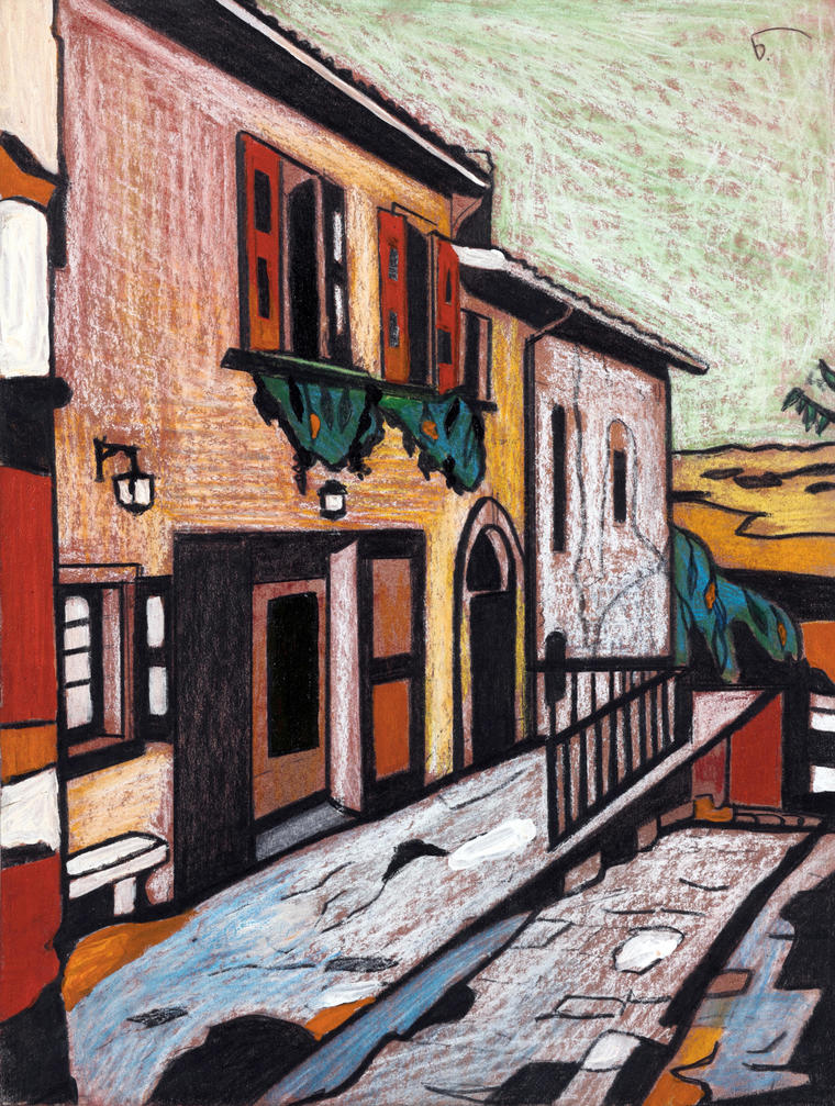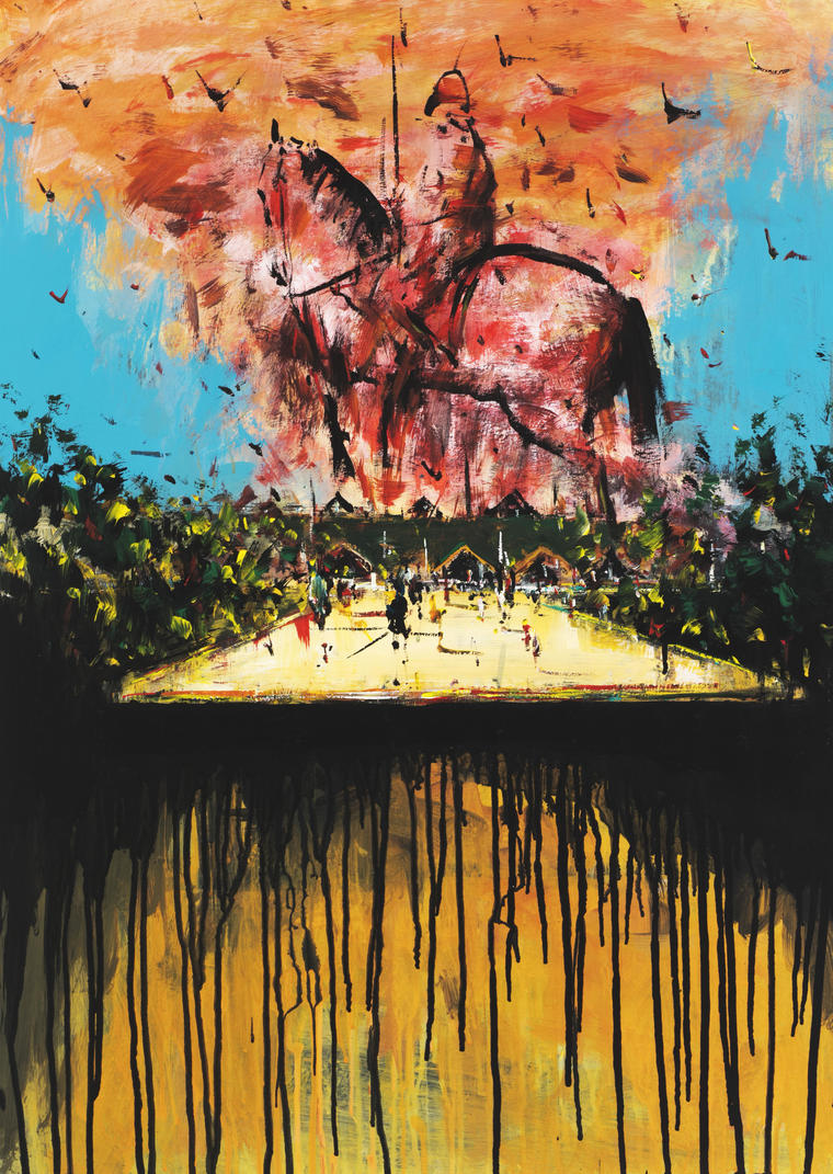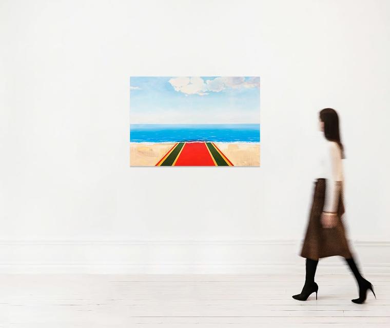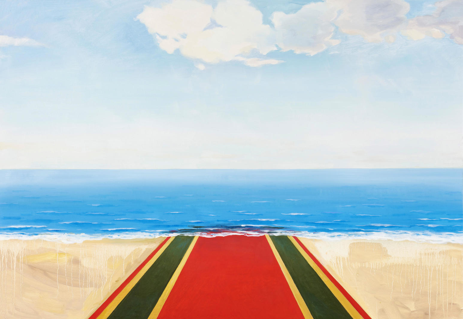 Представленная работа «Красное море» отсылает к знаковому полотну Эрика Булатова «Горизонт» 1971–1972 года, где морской пейзаж делится на две половины красной полосой — орденской лентой или же ковровой дорожкой. Совмещение советского «парадного» символа с идиллическим ландшафтом позднее стало одной из отличительных черт соц-арта, крупным представителем которого и является Эрик Булатов. Дарья Барыбина развивает традиции направления, помещая красную полосу уже не в центр холста, а наполовину выводя за пространство картины и наделяя прямым утилитарным значением, не лишенным легкой абсурдности: теперь это ковровая дорожка, ведущая к морю. Чистый бескрайний горизонт открывается зрителю, давая возможность почувствовать дух непринужденной легкости и свободы, не перечеркнутой напыщенной торжественностью идеологии. V