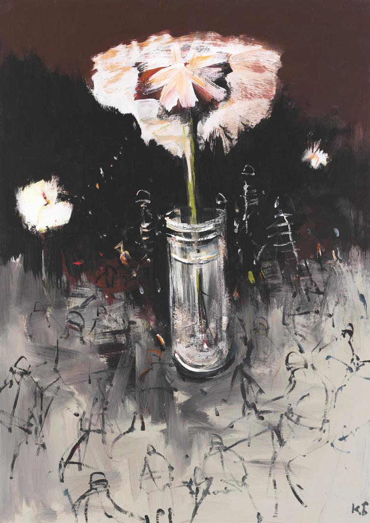Любимым жанром Константина Батынкова, конечно, можно считать пейзаж, на фоне которого обычно мчат лыжники, скачут наездники, кривляются клоуны в цирке. Но есть у него и портреты, и натюрморты, которые, несмотря на видимую статичность сюжета, всегда находятся в движении. Наглядным примером динамики в натюрмортах Батынкова может послужить картина «Цветок». С помощью мелких штрихов, рисующих еле различимые силуэты наездников на переднем плане работы, получается композиция, как бы застигнутая в процессе своей жанровой трансформации от натюрморта к батальной сцене. Изобилие деталей создает впечатление стремительно летящей фантазии художника, благодаря которой картина как бы пульсирует, дышит. V