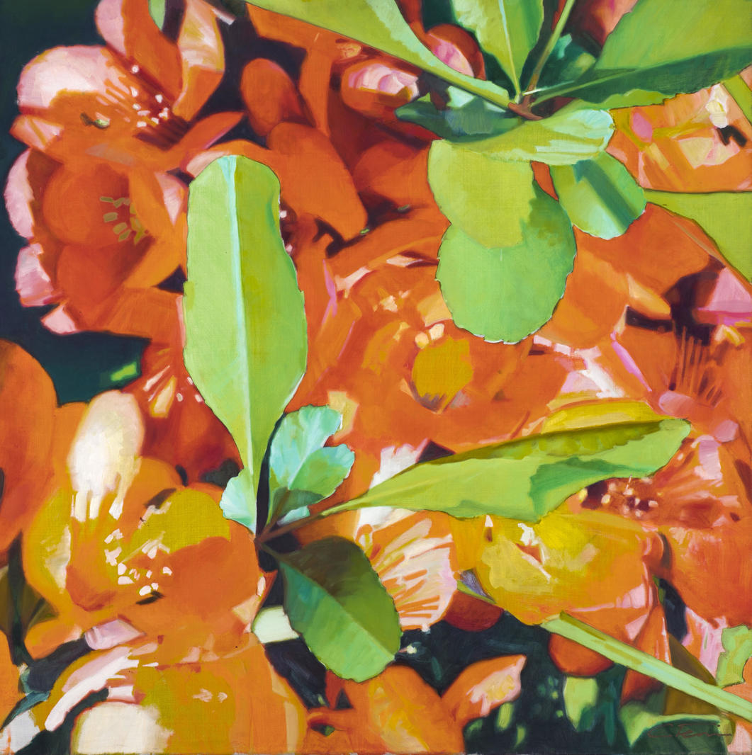 Цветок называется японская айва. Цветы небольшие, волшебного оранжевого цвета. Растут у меня на даче. Сюжет появился за счет очень сильного увеличения фотографии. Это реальность! Название «Шакти» было придумано в процессе работы. Это название музыкальной группы Джона Маклафлина, очень популярной в 70-х–80-х годах. В ней очень много от индийской музыки. Я много работал с этой музыкой. Шакти — это буддийское божество, жена Шивы, женское космическое, пульсирующее начало. Собственно, именно об этом и эта картина.