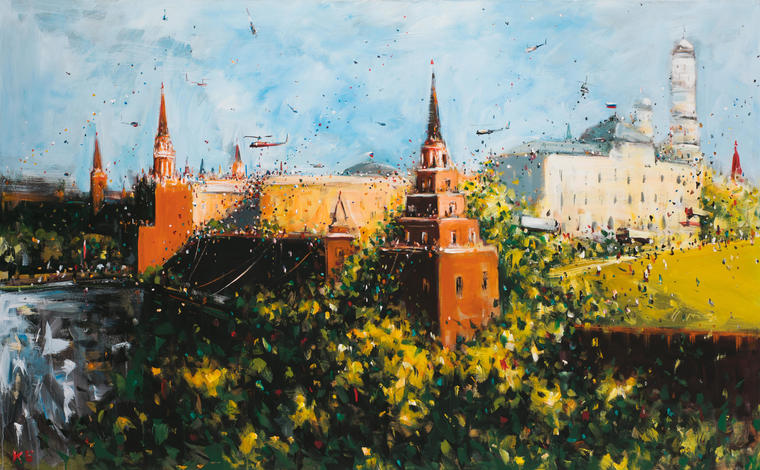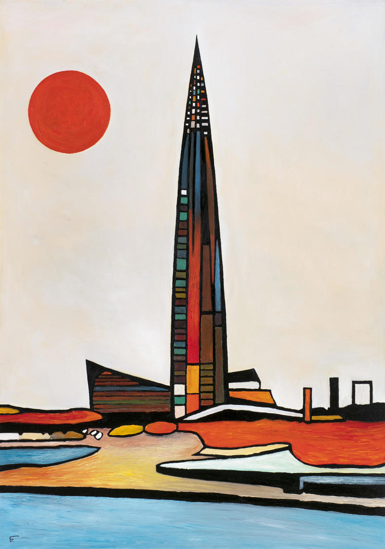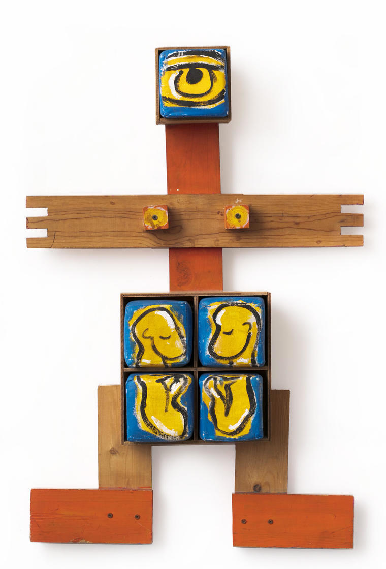 Вероятно, с влиянием этих и других авангардных мастеров связана и примитивизация форм в работе «Девушка с головой в своих руках». Сведение головы и лица до простого круга и нескольких линий в духе детского рисунка уже ранее встречалось в скульптурах Сидура («Семья горшков» 1957 года или цикл «Праздник» 1965 года), как и сам мотив головы, существующей отдельно от тела. Девушка словно жонглирует своими головами, выбирая из них более подходящую на данный момент, и несмотря на то, что головы улыбаются, сочетание красного и черного в центре композиции придает этому образу демонический оттенок. Здесь в психоделичных переливах цветов вдруг проявляются другие тела, фигуры, растения, чтобы через мгновение снова слиться друг с другом и девушкой с головой в руках. V