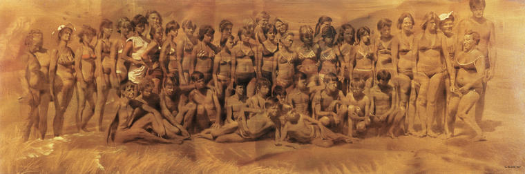 Большинство женских образов напоминают своим обликом Юлию Нельскую, супругу Сидура. У них правильные черты лица, большие глаза и нередко стрижка-каре. Все эти «приметы» можно наблюдать и в рисунке «Лежащая с обнаженной грудью» 1968 года. Полуобнаженная модель, одетая в красивую кружевную комбинацию (предмет мечтаний многих советских женщин), томно возлежит, опираясь на правую руку. Левая рука, с ярко-красным маникюром, акцентирует внимание зрителя на груди, кокетливо выглядывающей из кружев. В поэтическом восприятии художника ее сосок здесь становится подобен маленькому солнцу, взошедшему над пеной кружевных волн. Эффект особой белизны тела возникает за счет того, что мастер оставляет незакрашенными довольно большие участки листа, и тем ярче кажутся окружающие эту белизну неоновые цвета фломастеров. Их Сидур использует особенно часто во второй половине 1960-х, исследуя изобразительные возможности этой ультра-новой техники при создании цветных рисунков (первые фломастеры появились в Европе только в 1960 году). Мягкие очертания тела модели, круглящиеся линии ее форм отчасти напоминают произведения Матисса и Пикассо 1930-х, которые Сидур несомненно видел на выставках, что в эпоху оттепели были еще возможны.