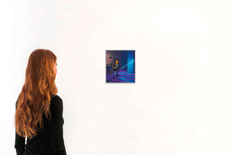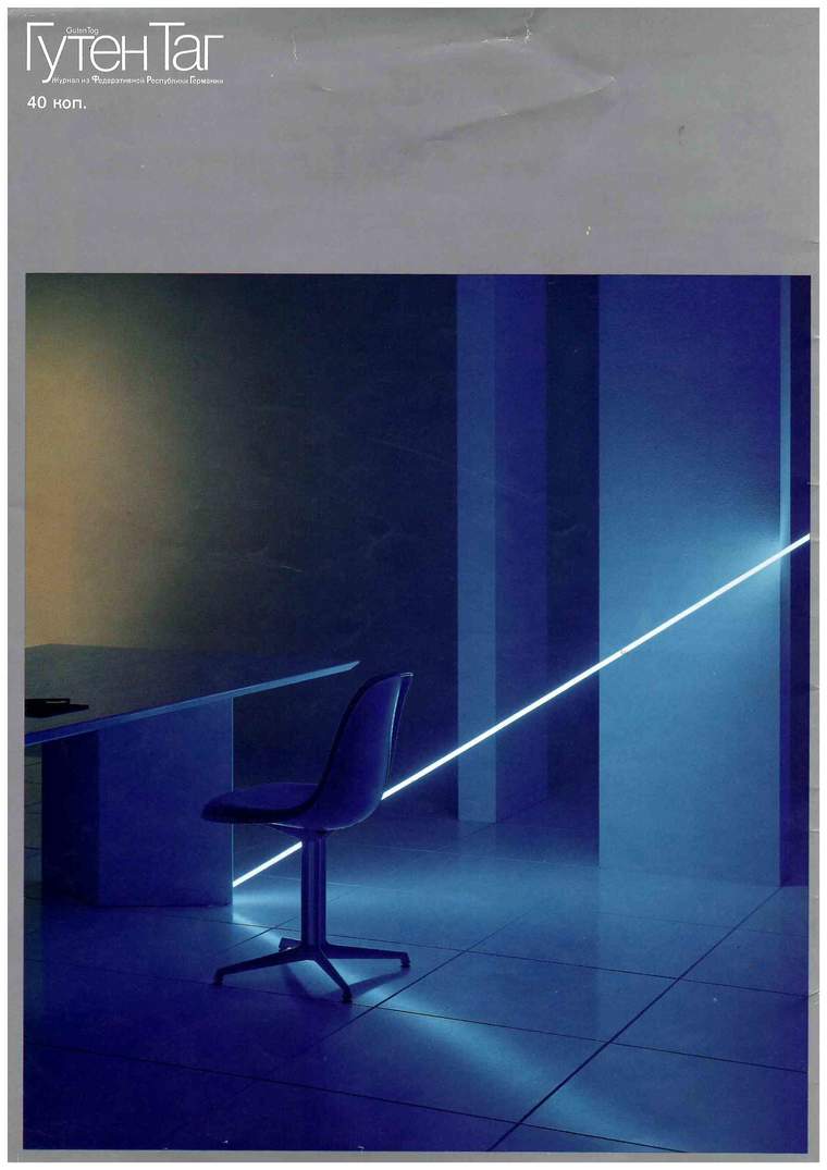 Представленная работа 1987 года выполнена на обратной стороне журнала «Гутен Таг», вышедшего в апреле. Издание распространялось по подписке и было создано правительством ФРГ для налаживания отношений с СССР, осложненных холодной войной. Затрагиваемые темы были разнообразны, но большая роль всегда отводилась культурной жизни Германии. Отвечая духу «Новых художников», использовавших для своих работ самые разные материалы, Андрей Крисанов наносит своего фирменного персонажа с квадратной головой на заднюю обложку журнала, создавая, таким образом, не только произведение искусства, но и целое визуальное высказывание об историческом времени и его приметах. Лаконизм и простота форм, флуоресцентные, яркие цвета, используемые художником, привносят в образ анимационную эстетику.