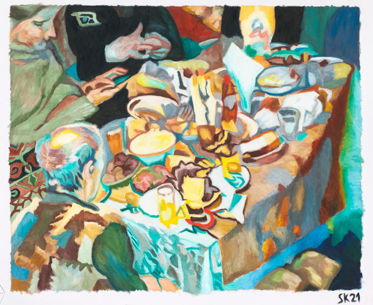 На представленной работе передан узнаваемый образ типичной постсоветской семьи, фотографии с таких же застолий есть в альбоме каждого дома. Для кого-то они — предмет теплой ностальгии, для других — болезненное напоминание о непростых временах новой России. Скутару ближе первое, с такой нежностью показывает он своих героев в семейном кругу, использует теплую цветовую палитру, застает врасплох, изображает естественными и непринужденными. Вместе с художником мы наблюдаем, как персонажи картины приспосабливаются к новой реальности со смартфонами и капиталистическим разнообразием товаров, но при этом сохраняют свой неповторимый облик, несут отпечаток пережитого времени. V