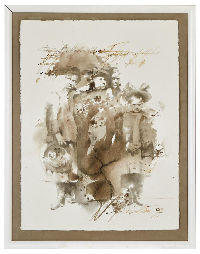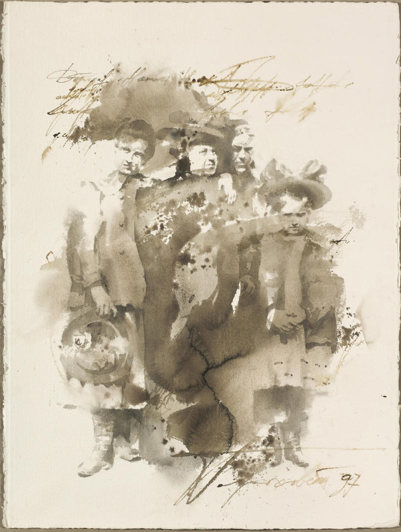 В начале 1990-х, в эпоху крушения не просто «страны СССР», а целого образа жизни и системы ценностей, когда общество было вынуждено сосредоточиться на выживании, в сфере культуры и искусства началось активное осмысление опыта недавней истории. Начиная с 1990 года Гороховский вновь обращается к мотиву старых семейных фотографий, теперь преимущественно из советского прошлого. В этот период и была создана представленная работа «Прощание со временем» 1997 года. Основа композиции — старая черно-белая фотография с изображением одной семьи, одетой по моде начала XX века. Выполненная тушью поверх бумаги, она производит впечатление видения, миража, который вот-вот рассеется. Этот сновидческий образ смешивается со строчками из писем, случайными словами из прошлого. На момент создания картины в 1997 году все участники этого фото уже состарились, стерлись из памяти, как и их лица на этой работе, — они больше не конкретные люди, а условные представители ушедших лет. Это даже не воспоминание, а лишь тень от него, которая способна на мгновенье перенести в те времена, которые уже не вернуть. V
