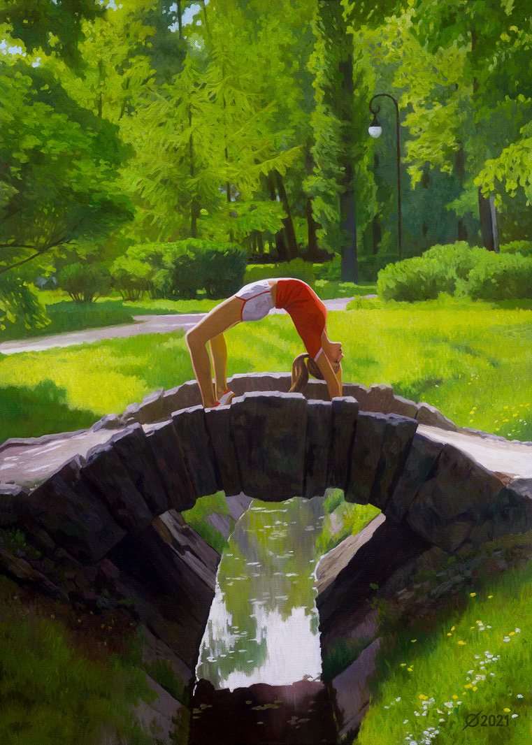 Или она вдруг вспомнила какую-то живописную картину с изображением моста и решилась на сиюминутный перфоманс, встав на мостик? И это тоже верно.