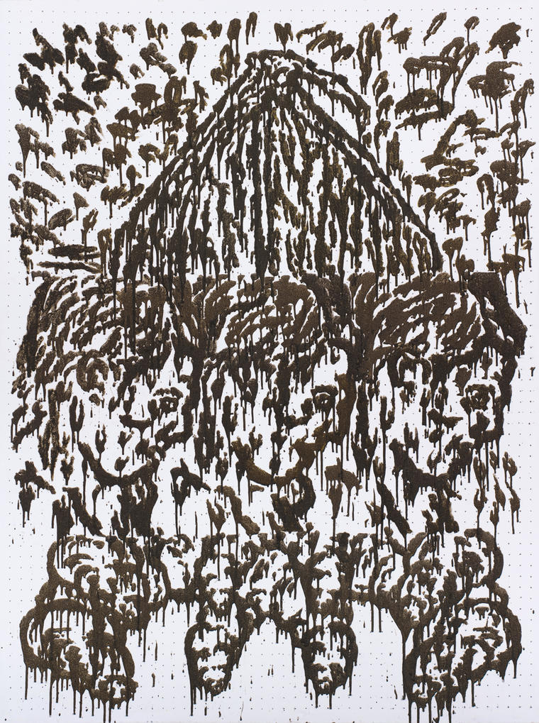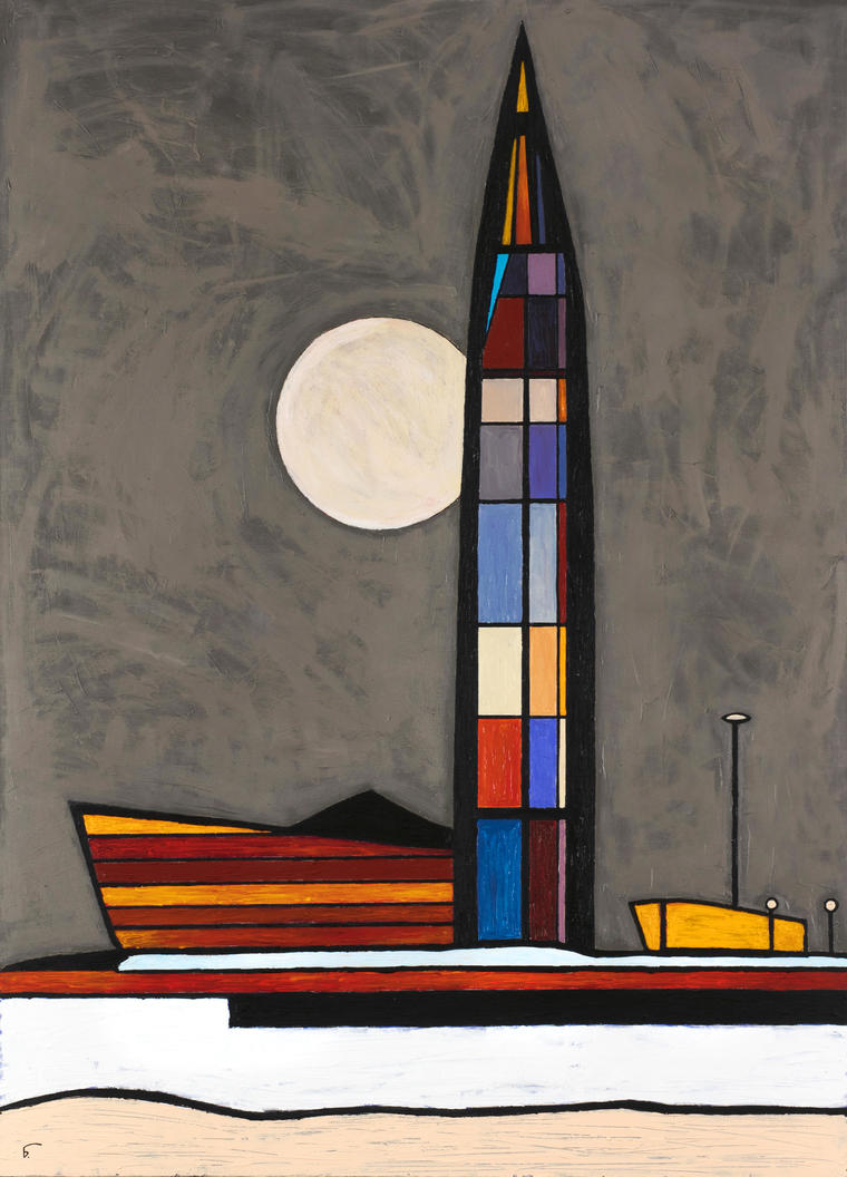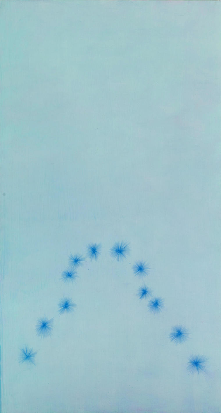 Представленная работа 1994 года относится к известной серии «De la Napoule» (получившей название по небольшому курортному городку на Лазурном берегу Манделье-ла-Напуль), в которой природным фоном послужило солнечное море юга Франции. Для работ этой серии характерны линии, собравшие в себе основную цветовую гамму Лазурного берега, органично вписанные в пейзаж и словно являющиеся цветовой телевизионной тестовой таблицей, хорошо знакомой пользователям старых телевизоров с кинескопом: но здесь «настраивается» не «картинка в телевизоре», а сам зритель, глаза которого привыкают к незнакомой ему оптике. Как и в других работах серии, линии строго привязаны к определенному пространству; мы видим четко выраженную оппозицию верха-неба и низа-моря, где основной уровень линий ограничен горизонтом. Однако в середине изображения линии словно прорываются через природную границу вверх, в небо: категория движения, преодоления природных границ связана и с подразумеваемой попыткой применить уже знакомую цветовую схему-таблицу к неизведанному пространству. V