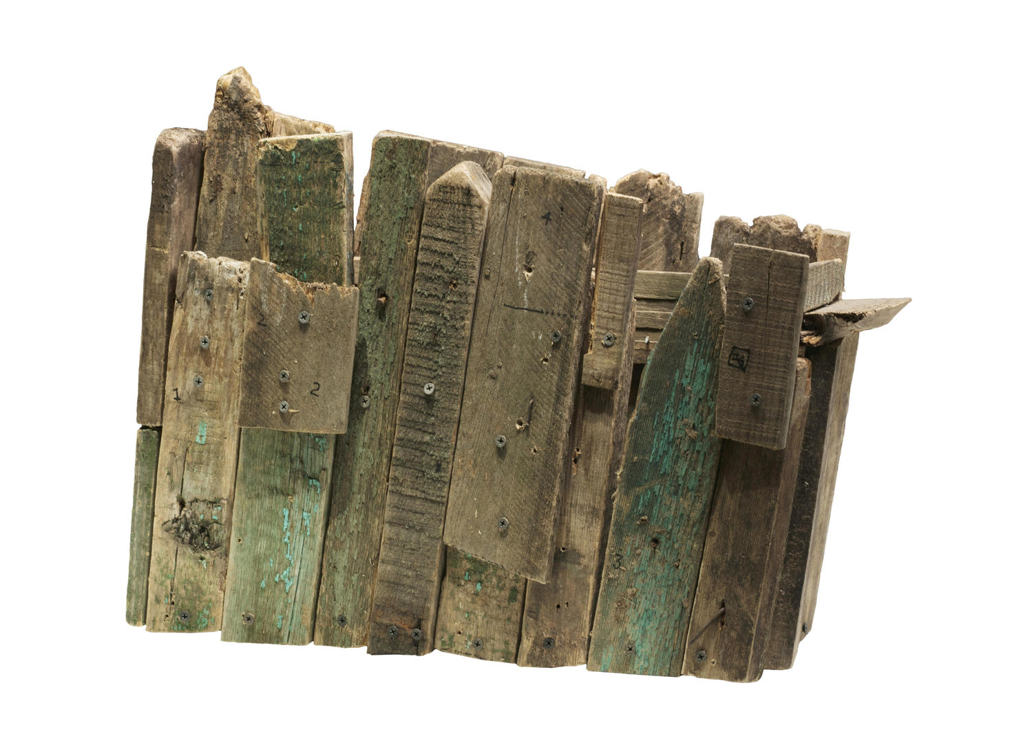 Александр Бродский ломает масштаб утилитарных архитектурных сооружений, низводя их до размера небольших хрупких артефактов, буквально сувениров. Представленный объект 2020 года воплощает в себе дачный ландшафт — череду покосившихся заборов, на которых кое-где еще сохранилась потрескавшаяся зеленая краска. «Работа сделана из старых заборов моей дачи, — рассказывает Александр Бродский, — я там прожил всю жизнь, эти палочки с детства мне знакомы, вот я и решил сколотить из них странную коробочку». Долгое время одним из лейтмотивов творчества художника было осмысление индустриального: из необожженной глины вылепливались здания фабрик, чьи заброшенность, ветхость и зыбкость намеренно подчеркивались с помощью техники и материала. В представленной работе Бродский, напротив, обращается к деревенской идиллии. В деревянном артефакте музеефицируется не только дачная среда, ее особая архитектура, но и само ощущение детской беззаботности, о котором напоминает возвращение в родной дачный дом, знакомый с ранних лет. Огромное пространство, с которым связано так много личного, сжимается до размера небольшой «коробочки». Бродский возвращает зрителя к истокам материальной культуры, сводя чувства и память к форме хрупкого макета, подчеркивая такую же хрупкость и всей истории человечества.