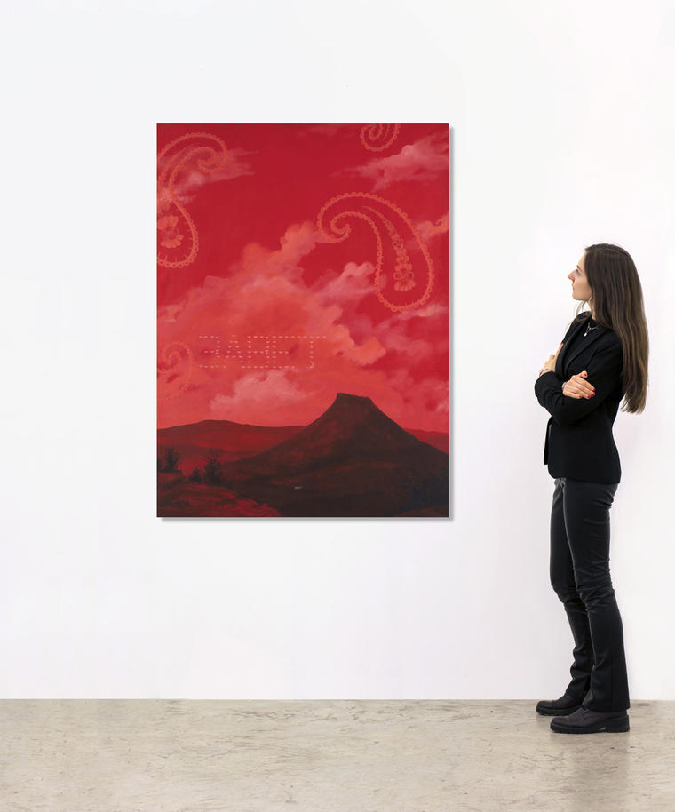 Андрей Филиппов, один из классиков современного российского искусства, практически с самого начала своего творческого пути последовательно работает с идеологемой XVI века «Москва — третий Рим». Эта политическая концепция, тесно связанная с институтом церкви, неизбежно должна была привести художника к ее корням, а именно — к Завету. По библейскому преданию Моисей получил Десять заповедей, начертанных на Скрижалях Завета, напрямую от Бога на горе Синай. На представленном полотне изображен пустынный пейзаж с горой, непосредственно отсылающий к этому сюжету. Красный, в цветовой гамме которого написана вся работа, — в христианской и ветхозаветной символике обозначает жертву. Это цвет крови жертвенных животных, страстей Господних, мученичества, огня веры. На полотне он полностью заливает все небо, по которому плывут облака и некие амебы, как называет их автор, напоминающие распространенный на Востоке узор «огурцы». На огромном облаке, самом не меньше горы, проявляется слово «Завет». Этот образ также неслучаен — по библейскому преданию, при исходе израильтян из Египта, в дневное время Бог являлся им в виде облака и указывал путь. Казалось бы, изображенное на полотне расшифровано, однако Андрей Филиппов закладывает еще несколько элементов, расширяющих концептуальную составляющую работы.