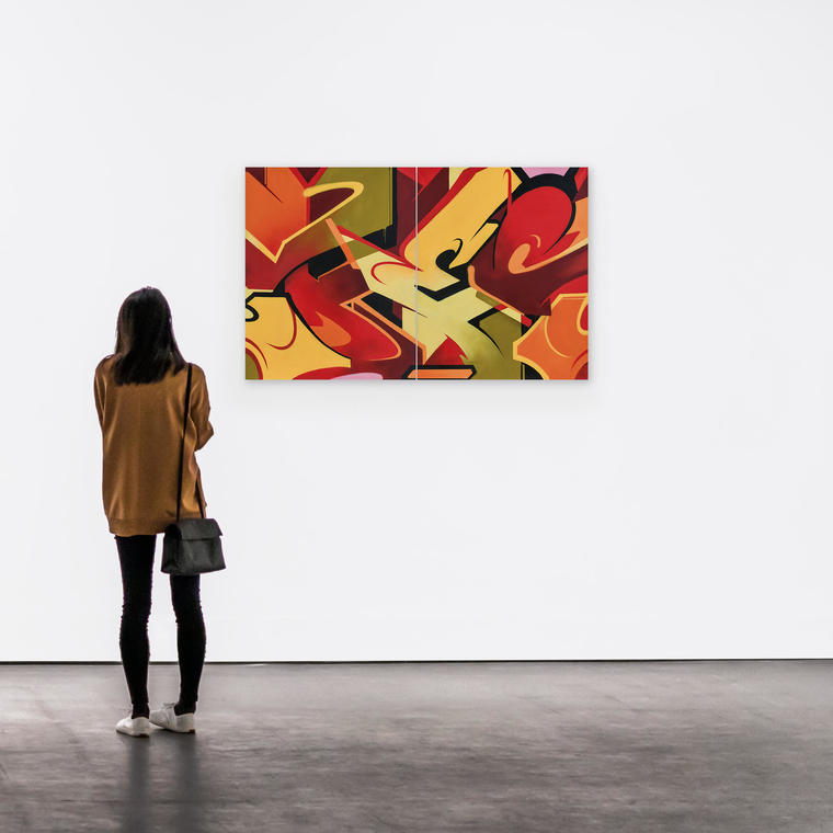 Человек, разбирающийся в уличном творчестве, в этих абстрактных формах обнаружит фирменный шрифт граффити-художника. Я начал экспериментировать с буквами на улицах в конце 90-х, и по сей день граффити является неотъемлемой частью моего творчества. Картина нарисована в 2016 году: в то время я начал создавать работы на холстах и экспериментировать. Этот диптих не просто граффити на холстах: он отражает один из переломных моментов в моем творчестве, который за 5 лет привел меня к персональной выставке на «Винзаводе» в пространстве VLADEY.
