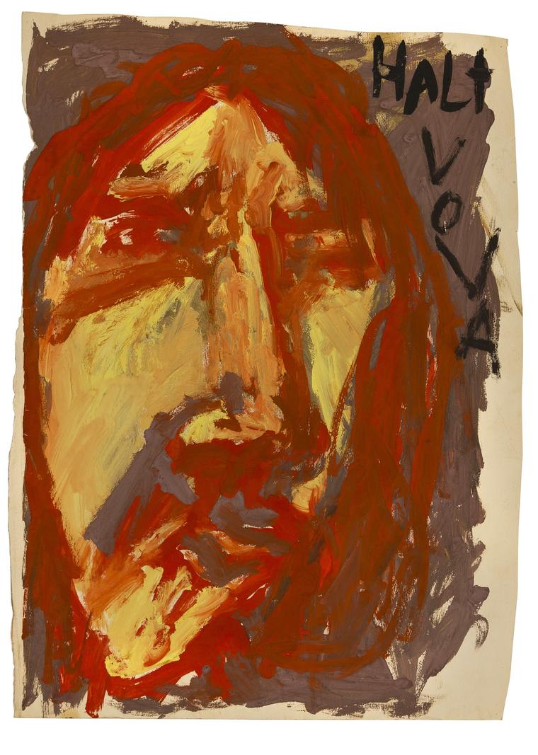 Представленная работа “Halt Vova” конца 1970-х годов — предположительно, портрет Владимира Сорокина, художника, музыканта, участника ленинградского сквота «НЧ/ВЧ» и друга Олега Котельникова. Само слово “halt” в переводе с немецкого означает «стоп». Сочетание императивного выражения в названии работы и экспрессивного стиля художника передают панковскую атмосферу 1970-1980-х годов. “Halt Vova” — редкое раннее произведение Олега Котельникова. Однако в нем уже прослеживается зарождение стиля «удар кисти». Позднее, это выражение будет выбрано в качестве заглавия для большой выставки «Новых художников», прошедшей в Русском музее в 2010 году. V
