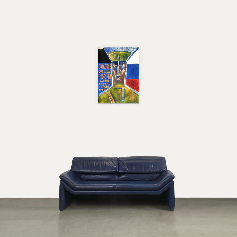 Основным медиумом Дмитрия Шагина является живопись с подчеркнуто наивной эстетикой, а главными образами его произведений — Ленинград и горожане. Представленная работа 1988 года выполнена в характерной для «Митьков» стилистике. Здесь есть уплощенная форма, а также образ солдата и триколор, которые задают нарратив, следующий патриотическим идеалам арт-группы и народными мотивами. При этом избранные Шагиным геометрически выверенные пропорции и жанр портрета не типичны для его художественной практики. В образе солдата времен Первой мировой войны автор композиционно выделяет глаза, подчеркивая их открытый, почти светящийся взор, что аллегорически отсылает к изображениям ликов святых в русской иконописи.