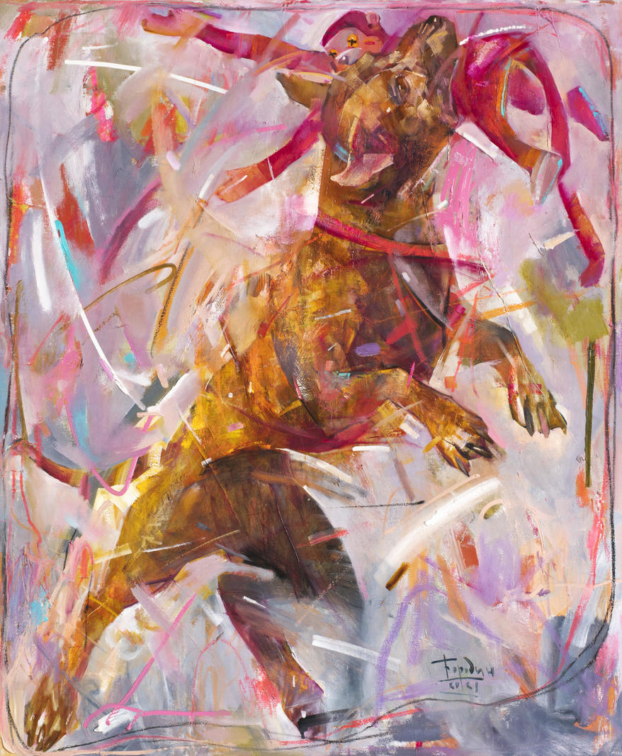Художник из Екатеринбурга Кирилл Бородин главными героями своих полотен делает природный мир, как настоящий, реалистичный, так и игрушечный, отсылающий к искусству китча и поп-арту. Закончив отделение театральной, а позднее станковой, живописи, художник работает плотными пастозными мазками и использует насыщенные цвета. Образы создаются из геометрических фигур и хаотичных штрихов, добавляющих картинам динамику, а композиция нередко отсылает к знаковым классическим полотнам. Запечатлевая абсурдные сюжеты, в которых действительность переплетается с сюрреальным видением, Кирилл Бородин рассуждает о многогранности и непредсказуемости жизни. V