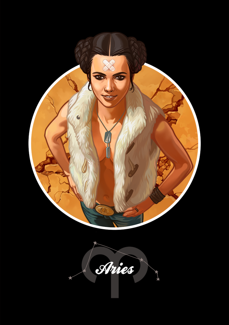 Героиня картины «Овен» олицетворяет собой упрямство, присущее данному зодиакальному знаку, готовность разбить и вставшее на ее пути препятствие, и собственный лоб (на котором красуется свежий пластырь). Девушка одета в жилет из «золотого руна», а общий стиль ее одежды напоминает опасных хиппи из фильма «Однажды в Голливуде». Она привыкла к битве со стенами, а стены дают трещину под ее натиском. Уверенная в себе, неудержимая, смело взирающая вперед и готовая дать отпор любому хищнику.