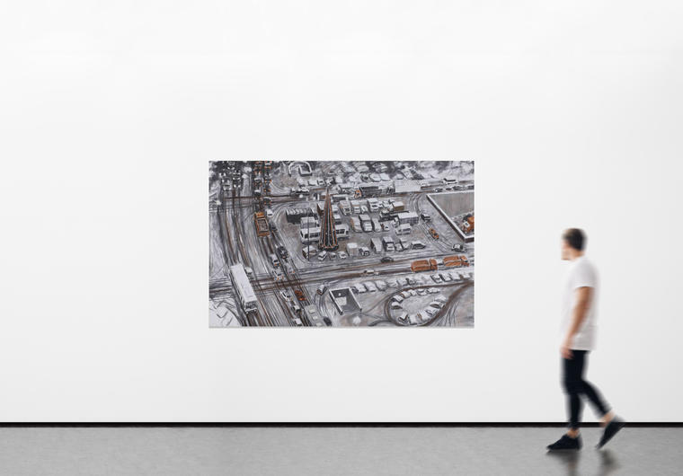 Вид сверху противопоставлен монументальной живописи, которая обычно представляет собой взгляд снизу. Мой же взгляд — это когда все скручивается и люди становятся маленькими, как и смыслы. Это монументальная живопись наоборот, строгий вид сверху».