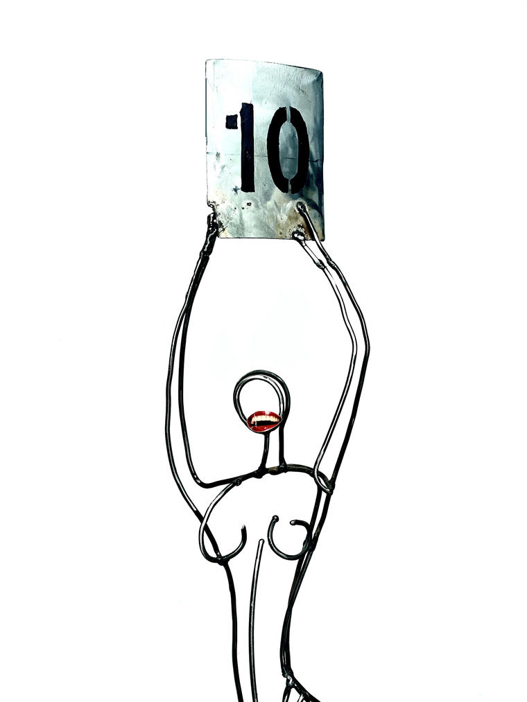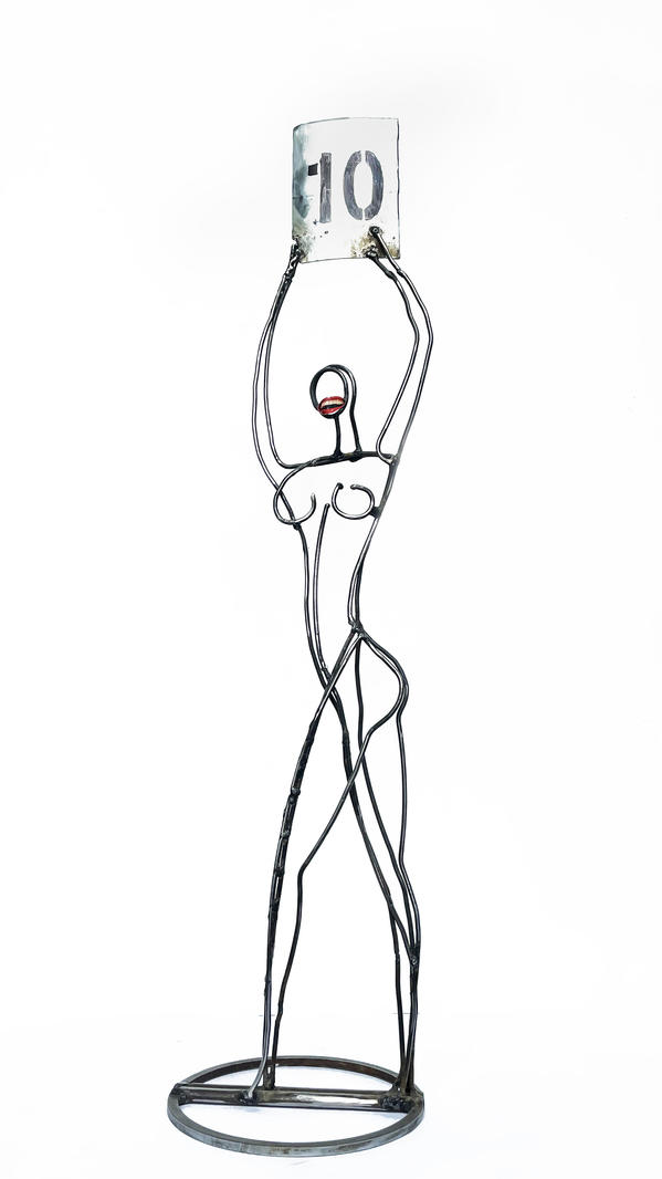 Профессия скульптора — наверное, самый тяжелый и долгий труд не только в творческом, но даже более в социальном плане. Фатхуллина смело гнет и вьет стальной прут, соединяет его с природным камнем, свободно пользуясь всей модернистской азбукой, начиная с обнажения приема и показа конструкции. Ее пластика графична, связана прежде всего с линией. Представленные работы из серии “Ring Girls” немного напоминают анимированных моделей с картин британца Джулиана Опи, и тоже насквозь ироничны: художница одним взглядом «срисовывает» фигуру, делает единственный цветовой штрих красной помады и дает в руки каждой героине листок с номером. Следующая! V