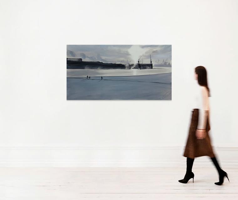 «Петербургские набережные и мосты уже давно входят в число излюбленных мотивов Ильи Овсянникова, где автор неизменно находит место новому фрагменту городской среды. Вместе с художником мы, словно шаг за шагом, движемся по набережным и преодолеваем расстояние между ними. В холодное или теплое время вдали от хрестоматийных туристических маршрутов и крупных транспортных узлов мы открываем наиболее выигрышные виды и сюжеты. Возможно, не случайно сейчас в «объектив внимания» живописца все чаще попадает устье Невы в районе Горного института с портовыми кранами, буксирами и редкими прохожими. В сопряжении индустриального мотива и широкого пространства невской акватории художник открывает для себя и для зрителя новый мотив, связанный с движением крохотных фигурок по крепкому зимнему льду. Условность монохромной гаммы и свобода живописного решения позволяют увидеть это движение как преодоление этого обширного опасного пространства, где мы вместе с героями Ильи Овсянникова как бы пробуем на прочность этот лед. Залогом надежности нерукотворной переправы, позволяющей вновь и вновь совершать по ней рискованные прогулки, в картине выступает пронзительный свет зимнего солнца. Это позволяет как бы физически ощутить однородную поверхность замерзшей реки и морозный воздух, наполняющий мощной энергией пар, поднимающийся ввысь возле высоких кранов. Проложенная по этой поверхности темная линия следов оживляет однородное белое пространство, делает его частью уже освоенной территорией мегаполиса, где люди ищут кратчайшие пути к месту назначения и неожиданно прочерчивают хорошо различимым пунктиром новые, пусть и недолговечные, магистрали на карте Петербурга».
