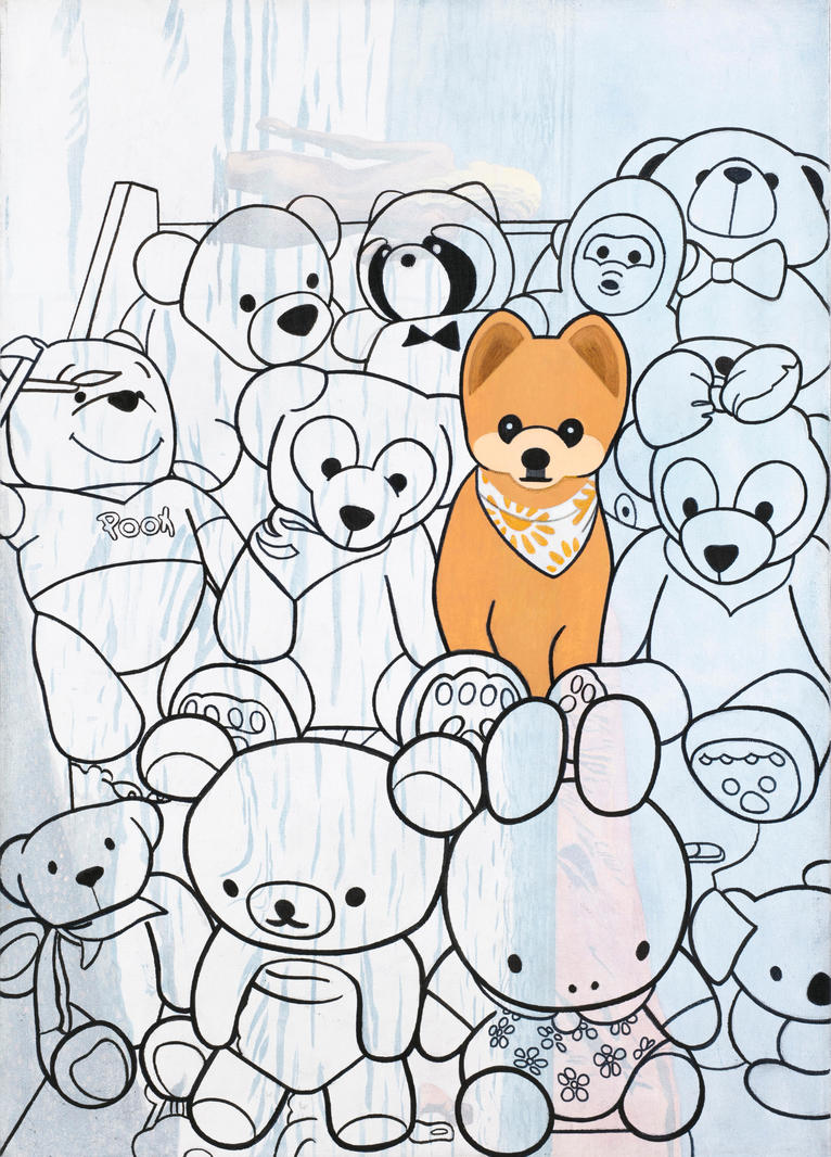 «Эта работа была начата еще в 2014 году. Тогда я стал писать "Крымский пейзаж" с найденной в интернете фотографии — не дописал и бросил на несколько лет. Потом решил загрунтовать холст. Грунт получился прозрачным. Сюжет со шпицем тоже давний, вот и все совпало. Маленькая собака доросла до роли придворной персоны, да и пейзаж изменился — остался недописанным».