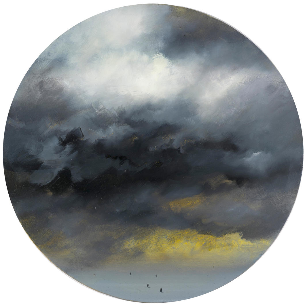Работа в характерной манере художника с туманным фоном и уменьшенными до предела силуэтами людей. Холодные и металлические оттенки, на первый взгляд, вырисовывают в воображении суровый и бездушный образ окружающей действительности, нависающей над незначительными фигурами людей. Но в то же время, благодаря размытости границ и плавно переходящим от более темных к более светлым оттенкам синего цвета, мы видим появление надежды на обретение силы, способной развеять тяжесть давящей стихии. Антитеза ничтожности человека и суровой бескрайней стихии является одним из основных лейтмотивов творчества Даниила Архипенко — противостояние реальности, как более глобальное отражение перманентных сомнений внутри личности самого человека.